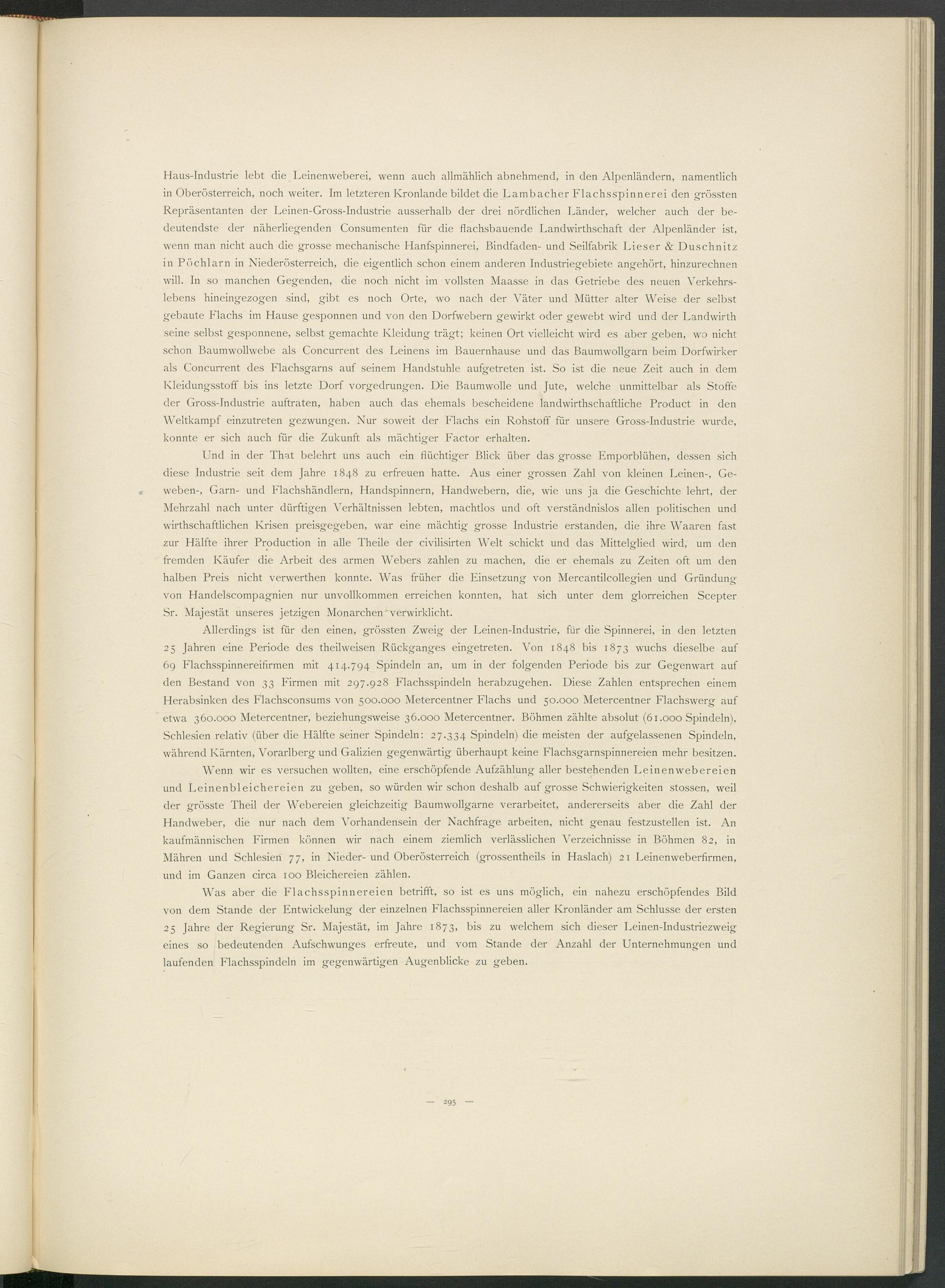 Allerdings ist für den einen, grössten Zweig der Leinen-Industrie, für die Spinnerei, in den letzten 25 Jahren eine Periode des theilweisen Rückganges eingetreten. Von 1848 bis 1873 wuchs dieselbe auf 69 Flachsspinnereifirmen mit 414.794 Spindeln an, um in der folgenden Periode bis zur Gegenwart auf den Bestand von 33 Firmen mit 297.928 Flachsspindeln herabzugehen. Diese Zahlen entsprechen einem Herabsinken des Flachsconsums von 500.000 Metercentner Flachs und 50.000 Metercentner Flachswerg auf etwa 360.000 Metercentner, beziehungsweise 36.000 Metercentner. Böhmen zählte absolut (61.000 Spindeln), Schlesien relativ (über die Hälfte seiner Spindeln: 27.334 Spindeln) die meisten der aufgelassenen Spindeln, während Kärnten, Vorarlberg und Galizien gegenwärtig überhaupt keine Flachsgarnspinnereien mehr besitzen.