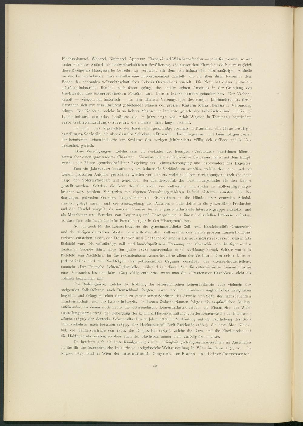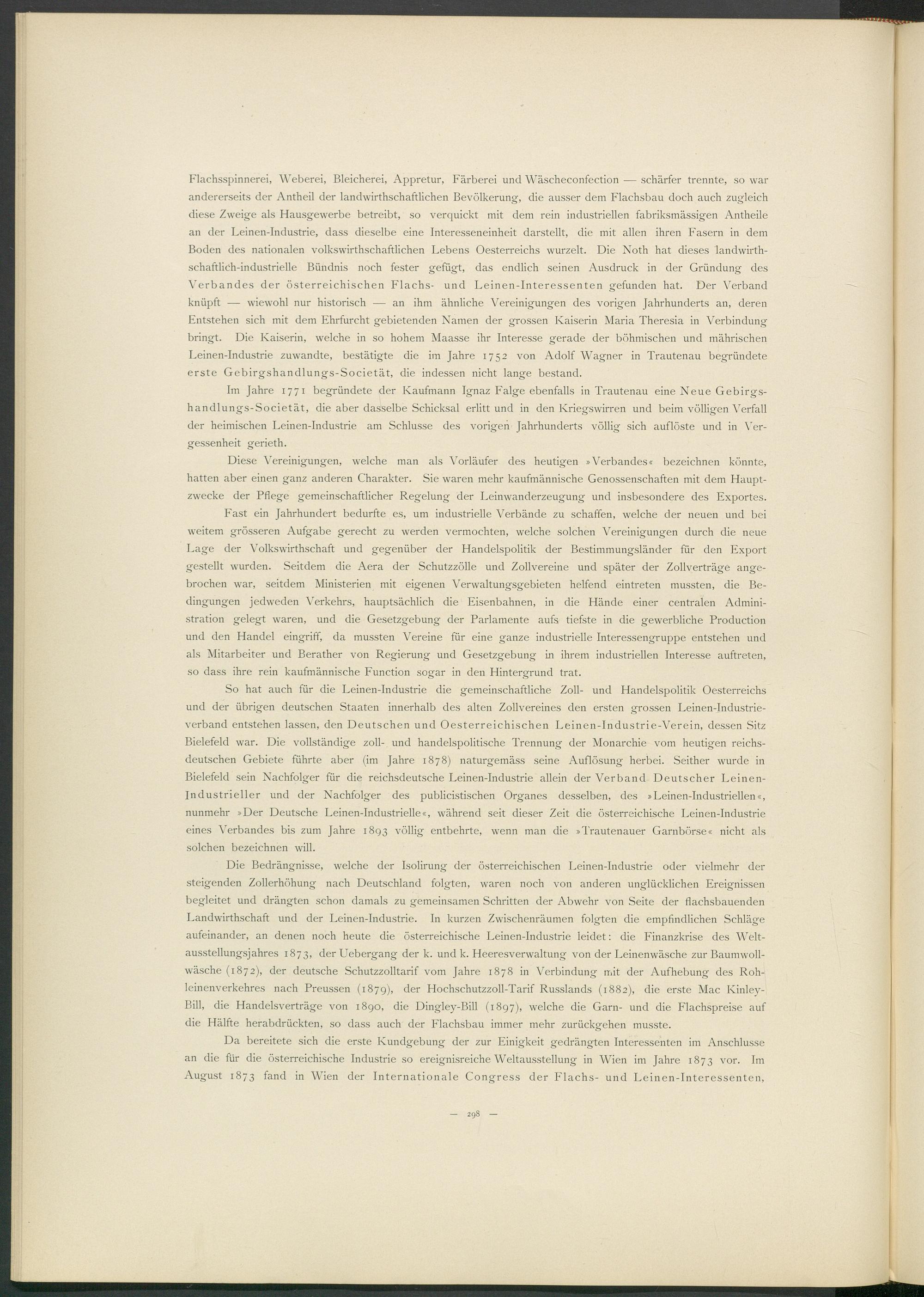 Flachsspinnerei, Weberei, Bleicherei, Appretur, Färberei und Wäscheconfection — schärfer trennte, so war andererseits der Antheil der landwirthschaftlichen Bevölkerung, die ausser dem Flachsbau doch auch zugleich diese Zweige als Hausgewerbe betreibt, so verquickt mit dem rein industriellen fabriksmässigen Antheile an der Leinen-Industrie, dass dieselbe eine Interesseneinheit darstellt, die mit allen ihren Fasern in dem Boden des nationalen volkswirthschaftlichen Lebens Oesterreichs wurzelt. Die Noth hat dieses landwirth- schaftlich-industrielle Bündnis noch fester gefügt, das endlich seinen Ausdruck in der Gründung des Verbandes der österreichischen Flachs- und Leinen-Interessenten gefunden hat. Der Verband knüpft — wiewohl nur historisch — an ihm ähnliche Vereinigungen des vorigen Jahrhunderts an, deren Entstehen sich mit dem Ehrfurcht gebietenden Namen der grossen Kaiserin Maria Theresia in Verbindung bringt. Die Kaiserin, welche in so hohem Maasse ihr Interesse gerade der böhmischen und mährischen Leinen-Industrie zuwandte, bestätigte die im Jahre 1752 von Adolf Wagner in Trautenau begründete erste Gebirgshandlungs-Societät, die indessen nicht lange bestand.