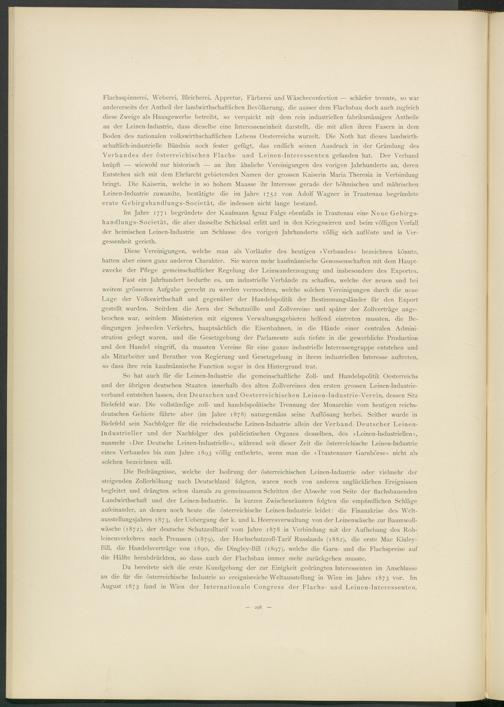 So hat auch für die Leinen-Industrie die gemeinschaftliche Zoll- und Handelspolitik Oesterreichs und der übrigen deutschen Staaten innerhalb des alten Zollvereines den ersten grossen Leinen-Industrieverband entstehen lassen, den Deutschen und Oesterreichischen Leinen-Industrie-Verein, dessen Sitz Bielefeld war. Die vollständige zoll- und handelspolitische Trennung der Monarchie vom heutigen reichs- deutschen Gebiete führte aber (im Jahre 1878) naturgemäss seine Auflösung herbei. Seither wurde in Bielefeld sein Nachfolger für die reichsdeutsche Leinen-Industrie allein der Verband Deutscher Leinen- Industrieller und der Nachfolger des publicistischen Organes desselben, des »Leinen-Industriellen«, nunmehr »Der Deutsche Leinen-Industrielle«, während seit dieser Zeit die österreichische Leinen-Industrie eines Verbandes bis zum Jahre 1893 völlig entbehrte, wenn man die »Trautenauer Garnbörse« nicht als solchen bezeichnen will.