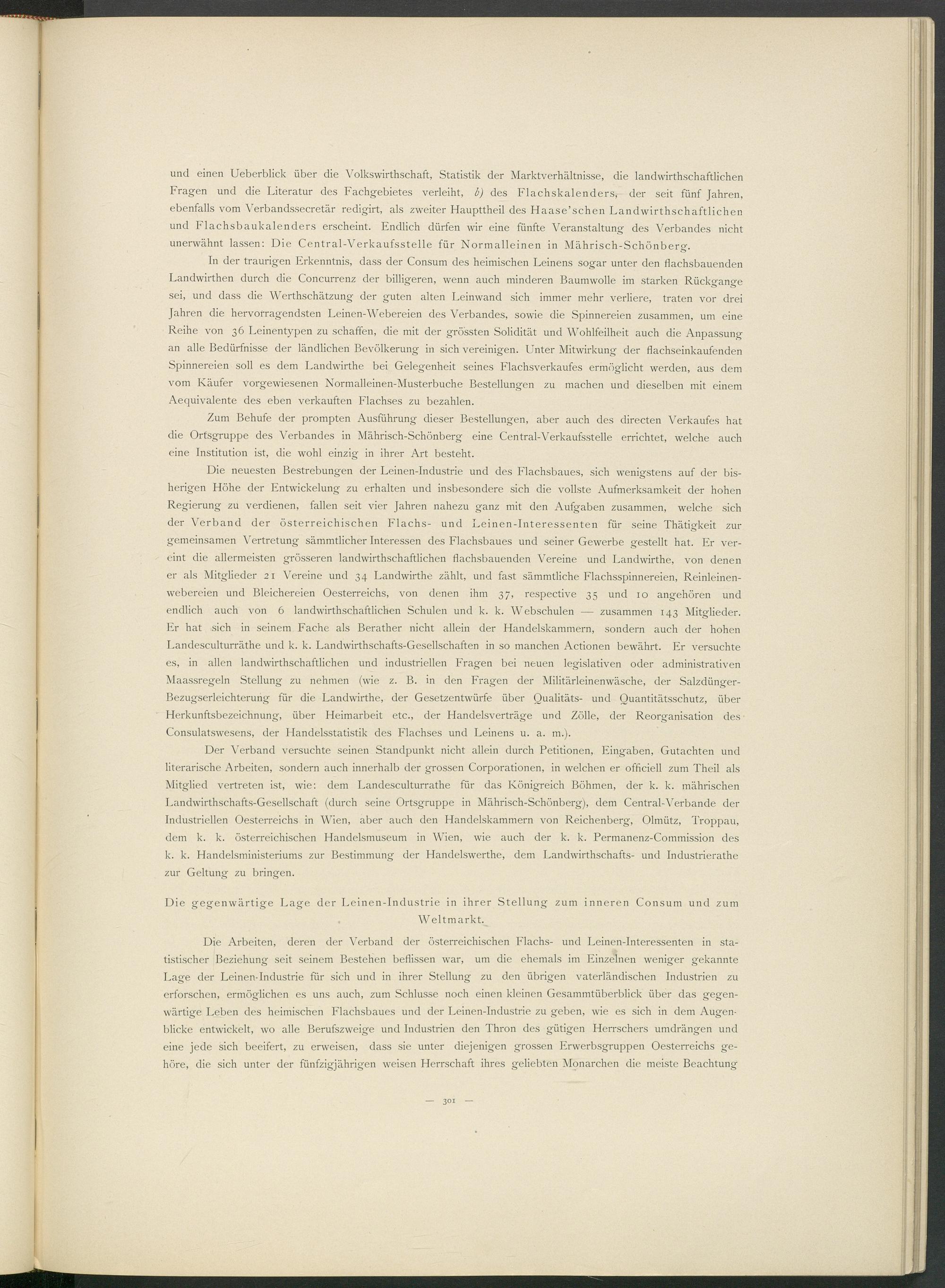 und einen Ueberblick über die Volkswirtschaft, Statistik der Marktverhältnisse, die landwirthschaftlichen Fragen und die Literatur des Fachgebietes verleiht, b) des Flachskalenders, der seit fünf Jahren, ebenfalls vom Verbandssecretär redigirt, als zweiter Haupttheil des Haase’schen Landwirthschaftlichen und Flachsbaukalenders erscheint. Endlich dürfen wir eine fünfte Veranstaltung des Verbandes nicht unerwähnt lassen: Die Central-Verkaufssteile für Normalleinen in Mährisch-Schönberg.