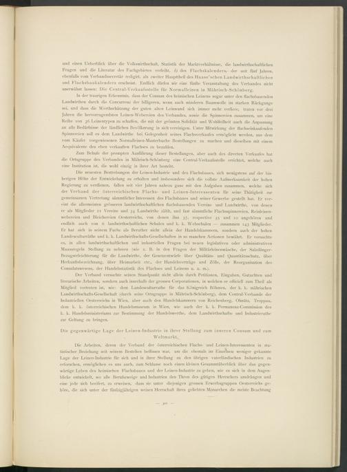 Die neuesten Bestrebungen der Leinen-Industrie und des Flachsbaues, sich wenigstens auf der bisherigen Höhe der Entwickelung zu erhalten und insbesondere sich die vollste Aufmerksamkeit der hohen Regierung zu verdienen, fallen seit vier Jahren nahezu ganz mit den Aufgaben zusammen, welche sich der Verband der österreichischen Flachs- und Leinen-Interessenten für seine Thätigkeit zur gemeinsamen Vertretung sämmtlicher Interessen des Flachsbaues und seiner Gewerbe gestellt hat. Er vereint die allermeisten grösseren landwirthschaftlichen flachsbauenden Vereine und Landwirthe, von denen er als Mitglieder 21 Vereine und 34 Landwirthe zählt, und fast sämmtliche Flachsspinnereien, Reinleinenwebereien und Bleichereien Oesterreichs, von denen ihm 37, respective 35 und 10 angehören und endlich auch von 6 landwirthschaftlichen Schulen und k. k. Webschulen — zusammen 143 Mitglieder. Er hat sich in seinem Fache als Berather nicht allein der Handelskammern, sondern auch der hohen Landesculturräthe und k. k. Landwirthschafts-Gesellschaften in so manchen Actionen bewährt. Er versuchte es, in allen landwirthschaftlichen und industriellen Fragen bei neuen legislativen oder administrativen Maassregeln Stellung zu nehmen (wie z. B. in den Fragen der Militärleinenwäsche, der Salzdünger- Bezugserleichterung für die Landwirthe, der Gesetzentwürfe über Qualitäts- und Quantitätsschutz, über Herkunftsbezeichnung, über Heimarbeit etc., der Handelsverträge und Zölle, der Reorganisation des Consulatswesens, der Handelsstatistik des Flachses und Leinens u. a. m.).