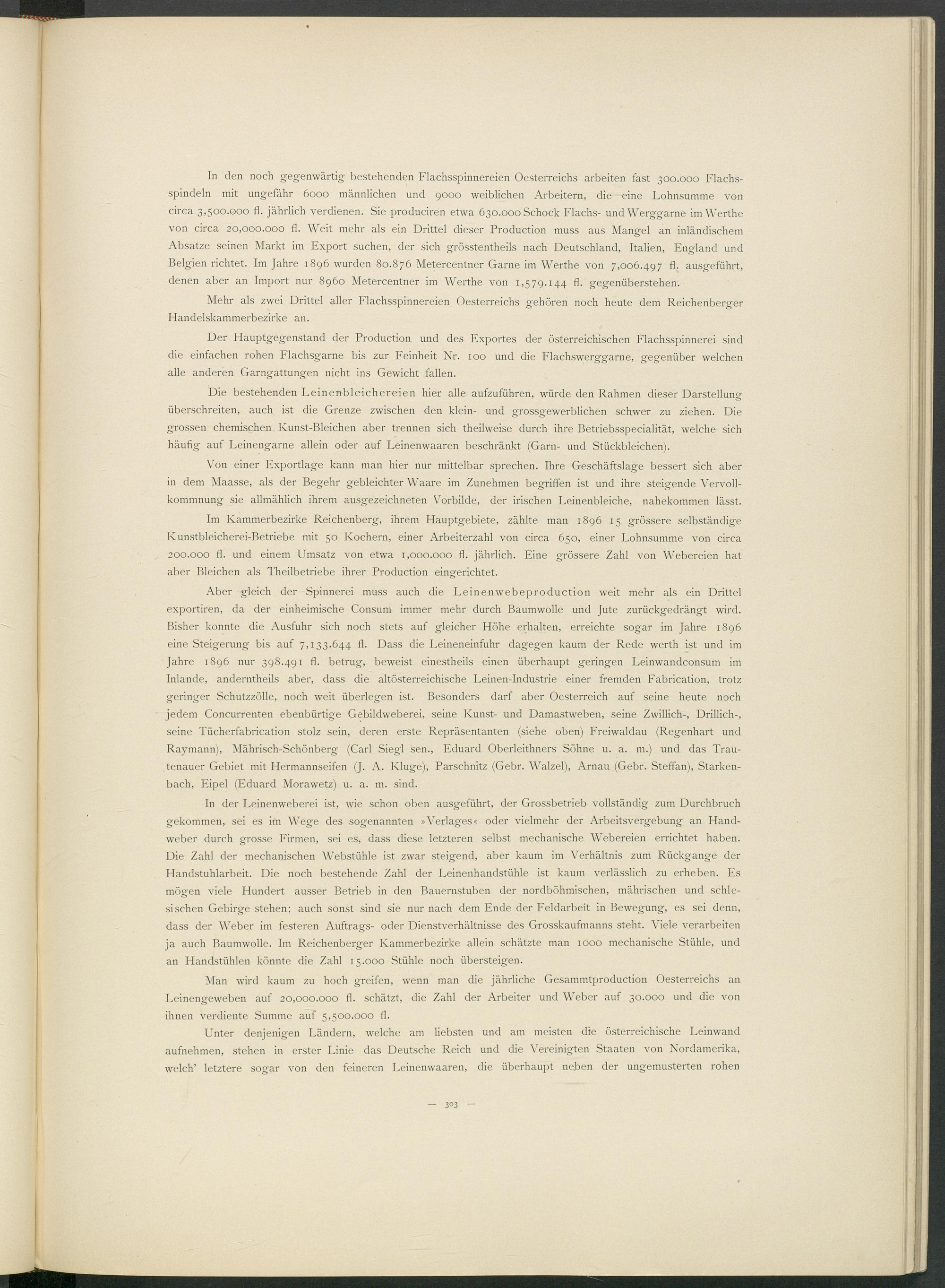 In den noch gegenwärtig bestehenden Flachsspinnereien Oesterreichs arbeiten fast 300.000 Flachsspindeln mit ungefähr 6000 männlichen und 9000 weiblichen Arbeitern, die eine Lohnsumme von circa 3,500.000 fl. jährlich verdienen. Sie produciren etwa 630.000 Schock Flachs- und Werggarne imWerthe von circa 20,000.000 fl. Weit mehr als ein Drittel dieser Production muss aus Mangel an inländischem Absätze seinen Markt im Export suchen, der sich grösstentheils nach Deutschland, Italien, England und Belgien richtet. Im Jahre 1896 wurden 80.876 Metercentner Garne im Werthe von 7,006.497 fl. ausgeführt, denen aber an Import nur 8960 Metercentner im Werthe von 1,579.144 fl. gegenüberstehen.