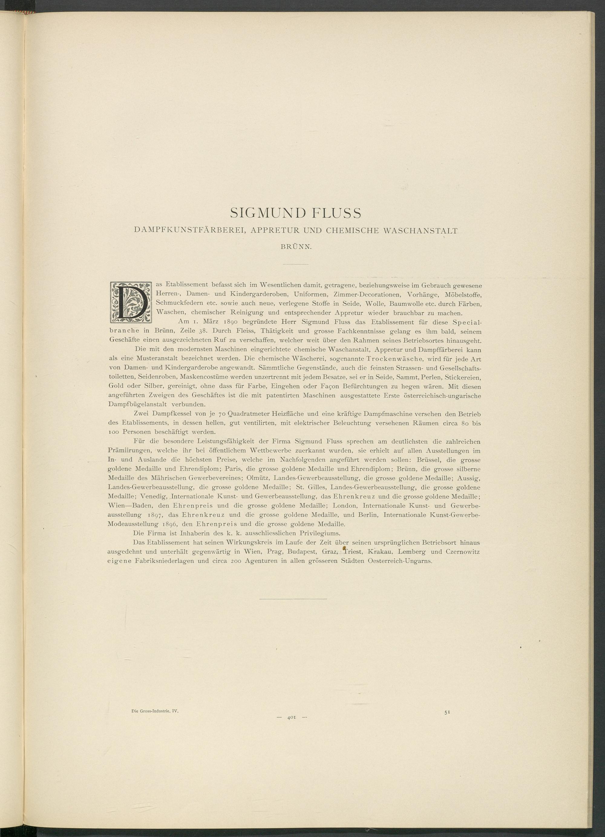 Für die besondere Leistungsfähigkeit der Firma Sigmund Fluss sprechen am deutlichsten die zahlreichen Prämiirungen, welche ihr bei öffentlichem Wettbewerbe zuerkannt wurden, sie erhielt auf allen Ausstellungen im In- und Auslande die höchsten Preise, welche im Nachfolgenden angeführt werden sollen: Brüssel, die grosse goldene Medaille und Ehrendiplom; Paris, die grosse goldene Medaille und Ehrendiplom ; Brünn, die grosse silberne Medaille des Mährischen Gewerbevereines; Olmütz, Landes-Gewerbeausstellung, die grosse goldene Medaille; Aussig, Landes-Gewerbeausstellung, die grosse goldene Medaille; St. Gilles, Landes-Gewerbeausstellung, die grosse goldene Medaille; Venedig, .Internationale Kunst- und Gewerbeausstellung, das Ehrenkreuz und die grosse goldene Medaille ; Wien—Baden, den Ehrenpreis und die grosse goldene Medaille; London, Internationale Kunst- und Gewerbeausstellung 1897, das Ehrenkreuz und die grosse goldene Medaille, und Berlin, Internationale Kunst-Gewerbe- Modeausstellung 1896, den Ehrenpreis und die grosse goldene Medaille.