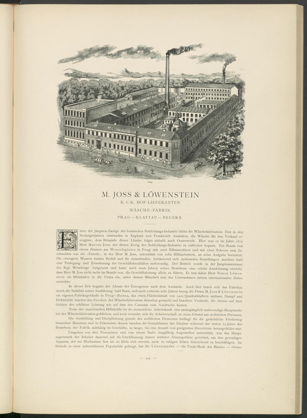 inen der jüngsten Zweige der heimischen Bekleidungs-Industrie bildet die Wäschefabrication. Erst in den Sechzigerjahren entstanden in England und Frankreich Anstalten, die Wäsche für den Verkauf erzeugten; dem Beispiele dieser Länder folgte alsbald auch Oesterreich. Hier war es im Jahre 1870 Herr Marcus Joss, der diesen Zweig der Bekleidungs-Industrie zu cultiviren begann. Ein Raum von einem Zimmer am Wenzelsplatze in Prag mit zwei Nähmaschinen und mit einer Scheere zum Zuschneiden war die »Fabrik«, in der Plerr M. Joss, unterstützt von zehn Hilfsarbeitern, an seine Aufgabe herantrat. Die erzeugten Waaren fanden Beifall und die einlaufenden, fortdauernd sich mehrenden Bestellungen machten bald eine Verlegung und Erweiterung der Geschäftslocalitäten nothwendig. Der Betrieb wurde in der Jungmannstrasse der Kgl. Weinberge fortgesetzt und hatte nach neun Jahren seines Bestehens eine solche Ausdehnung erreicht, dass Herr M. Joss nicht mehr im Stande war, die Geschäftsleitung allein zu führen. Es trat daher Herr Simon Löwenstein als Mitinhaber in die Firma ein, unter dessen Mitarbeit nun das Unternehmen seinen internationalen Zielen zustrebte.