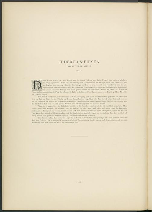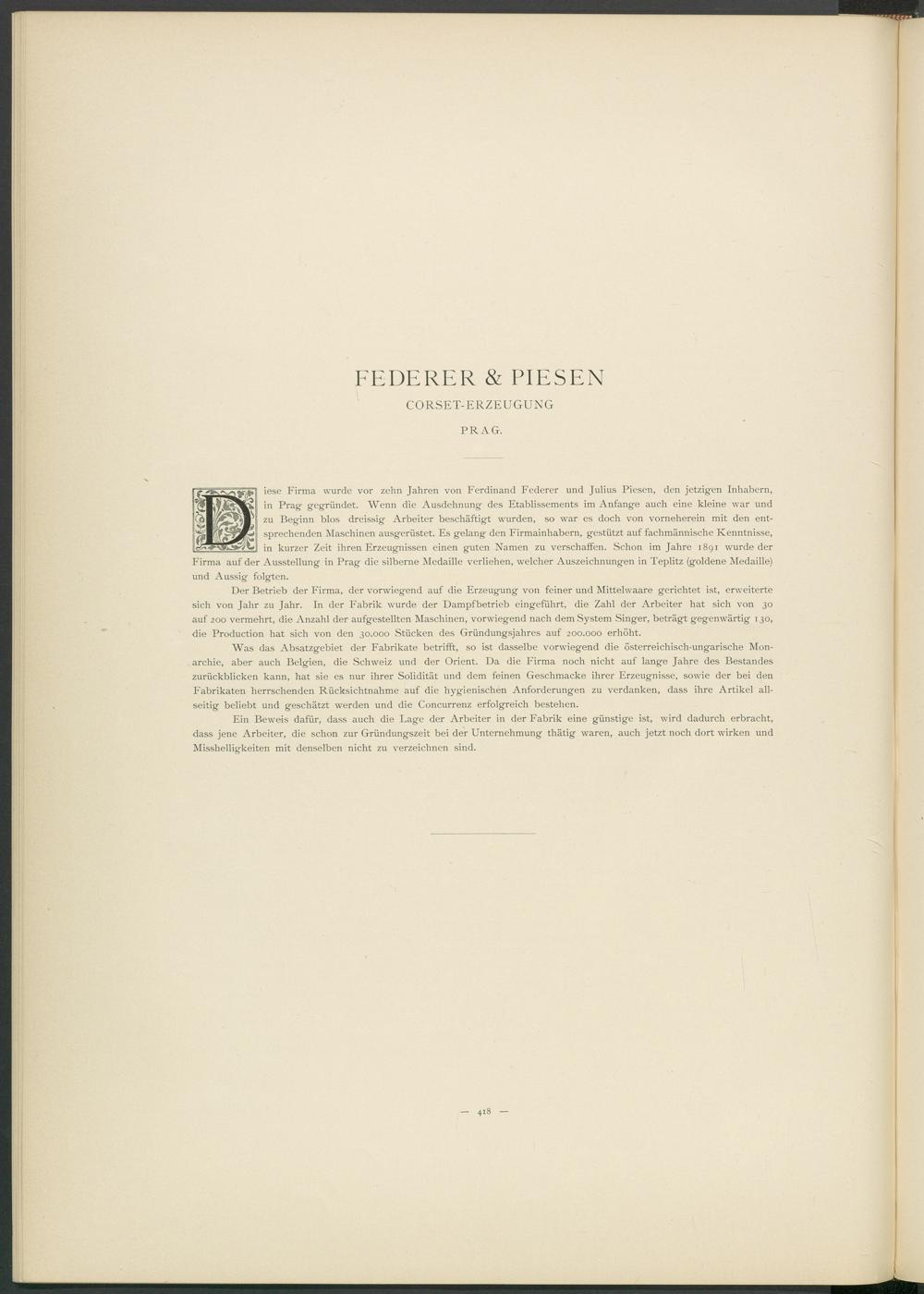 iese Firma wurde vor zehn Jahren von Ferdinand Federer und Julius Piesen, den jetzigen Inhabern, in Prag gegründet. Wenn die Ausdehnung des Etablissements im Anfänge auch eine kleine war und zu Beginn blos dreissig Arbeiter beschäftigt wurden, so war es doch von vorneherein mit den entsprechenden Maschinen ausgerüstet. Es gelang den Firmainhabern, gestützt auf fachmännische Kenntnisse, in kurzer Zeit ihren Erzeugnissen einen guten Namen zu verschaffen. Schon im Jahre 1891 wurde der Firma auf der Ausstellung in Prag die silberne Medaille verliehen, welcher Auszeichnungen in Teplitz (goldene Medaille) und Aussig folgten.