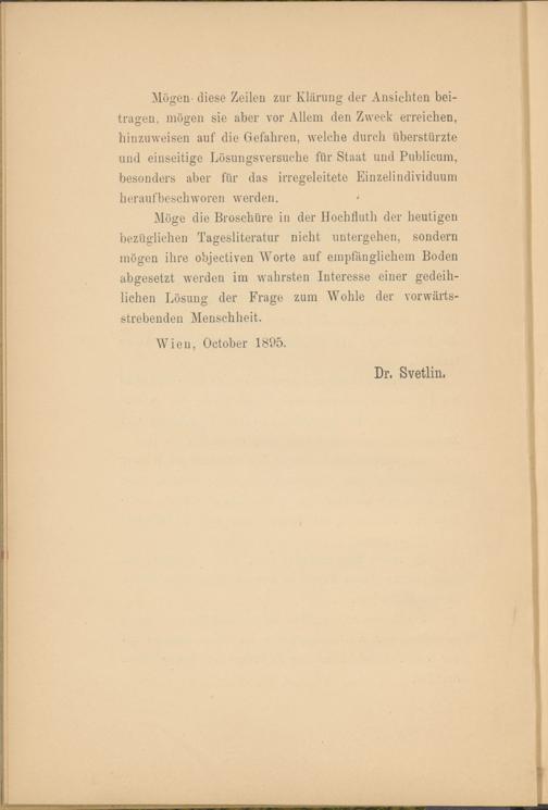 Möge die Broschüre in der Hochfluth der heutigen bezüglichen Tagesliteratur nicht untergehen, sondern mögen ihre objectiven Worte auf empfänglichem Boden abgesetzt werden im wahrsten Interesse einer gedeihlichen Lösung der Frage zum Wohle der vorwärtsstrebenden Menschheit.