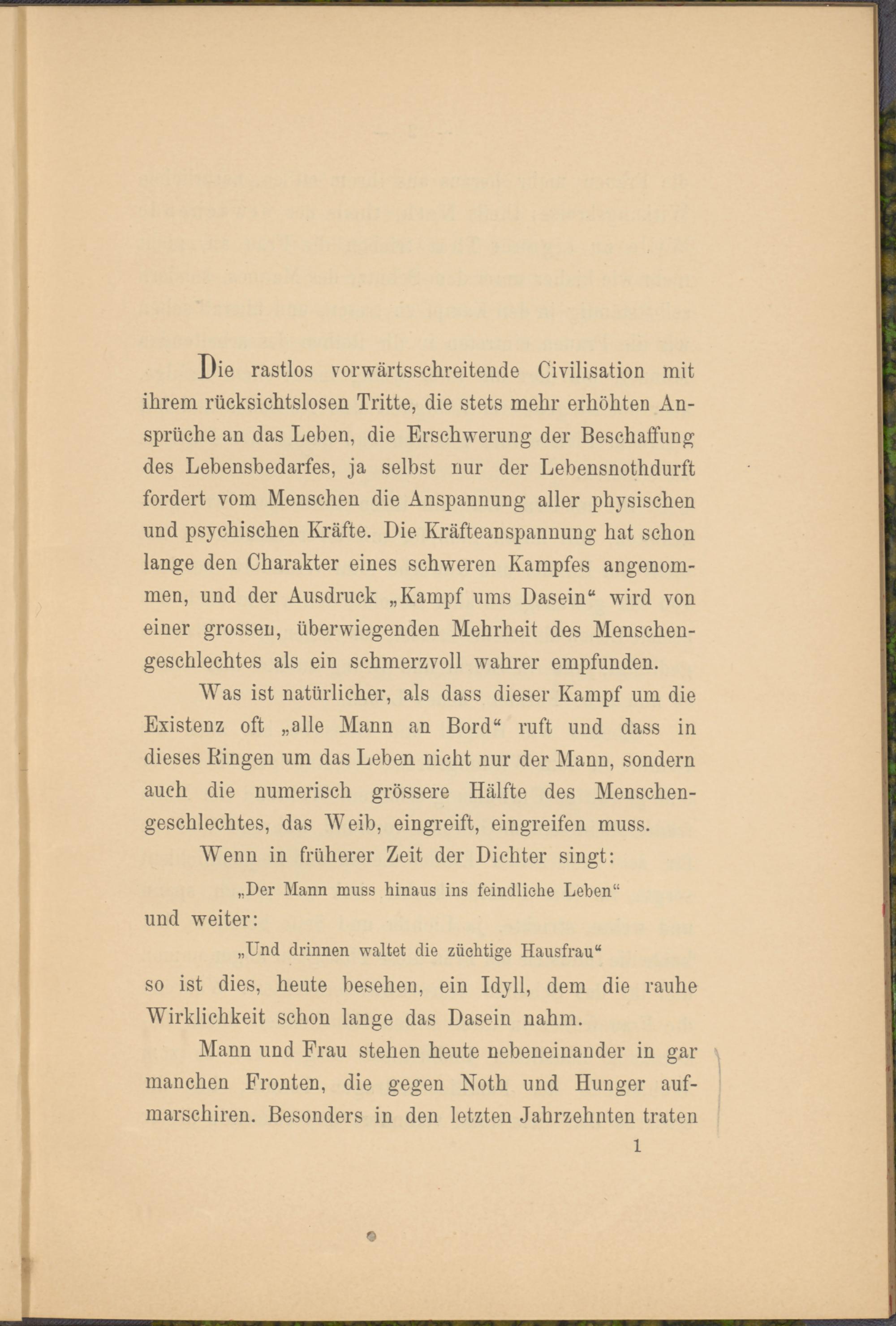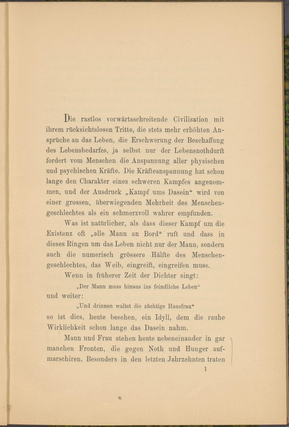 Was ist natürlicher, als dass dieser Kampf um die Existenz oft „alle Mann an Bord“ ruft und dass in dieses Bingen um das Leben nicht nur der Mann, sondern auch die numerisch grössere Hälfte des Menschengeschlechtes, das Weib, eingreift, eingreifen muss.