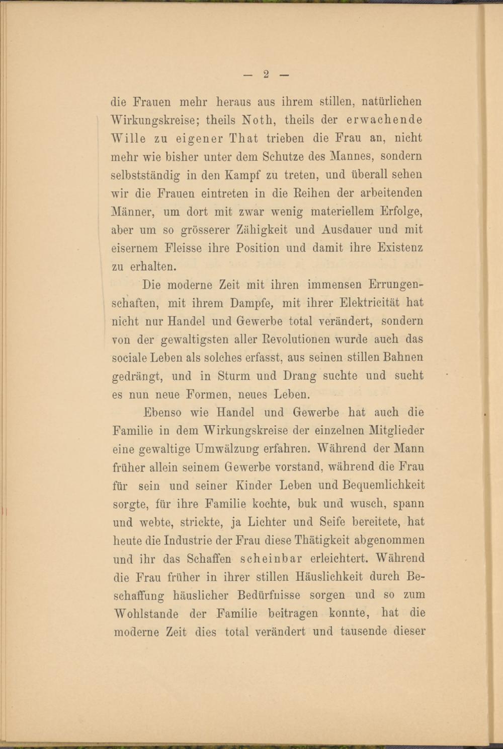 Ebenso wie Handel und Gewerbe hat auch die Familie in dem Wirkungskreise der einzelnen Mitglieder eine gewaltige Umwälzung erfahren. Während der Mann früher allein seinem Gewerbe Vorstand, während die Frau für sein und seiner Kinder Leben und Bequemlichkeit sorgte, für ihre Familie kochte, buk und wusch, spann und webte, strickte, ja Lichter und Seife bereitete, hat heute die Industrie der Frau diese Thätigkeit abgenommen und ihr das Schaffen scheinbar erleichtert. Während die Frau früher in ihrer stillen Häuslichkeit durch Beschaffung häuslicher Bedürfnisse sorgen und so zum Wohlstände der Familie beitragen konnte, hat die moderne Zeit dies total verändert und tausende dieser
