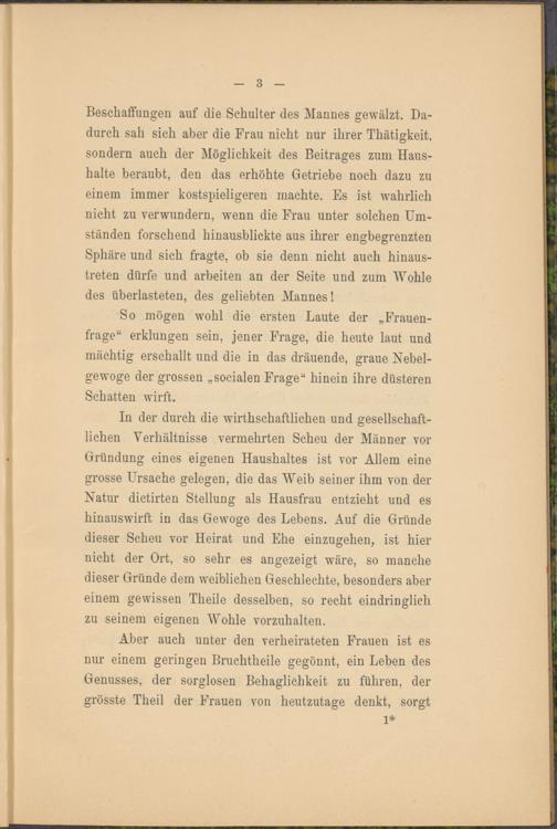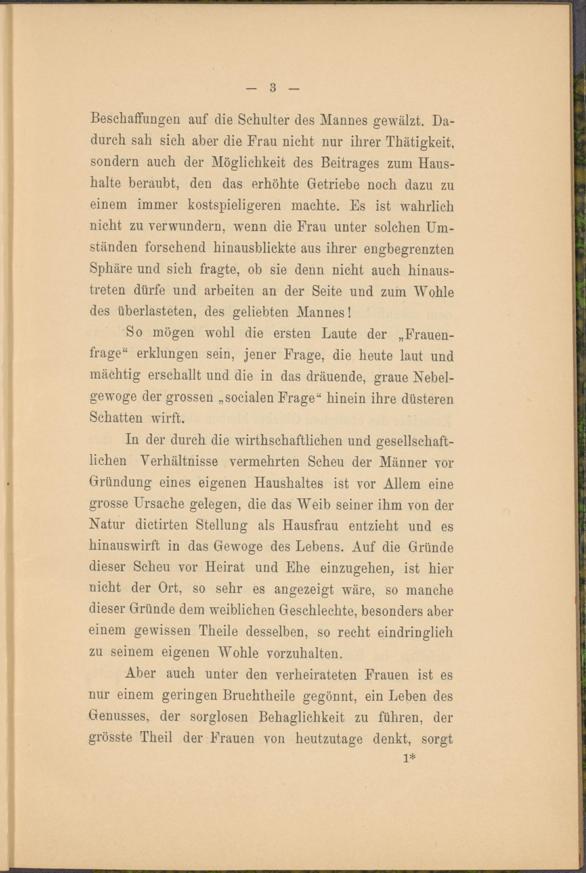 In der durch die wirthschaftlichen und gesellschaftlichen Verhältnisse vermehrten Scheu der Männer vor Gründung eines eigenen Haushaltes ist vor Allem eine grosse Ursache gelegen, die das Weib seiner ihm von der Natur dictirten Stellung als Hausfrau entzieht und es hinauswirft in das Gewoge des Lebens. Auf die Gründe dieser Scheu vor Heirat und Ehe einzugehen, ist hier nicht der Ort, so sehr es angezeigt wäre, so manche dieser Gründe dem weiblichen Geschlechte, besonders aber einem gewissen Theile desselben, so recht eindringlich zu seinem eigenen Wohle vorzuhalten.