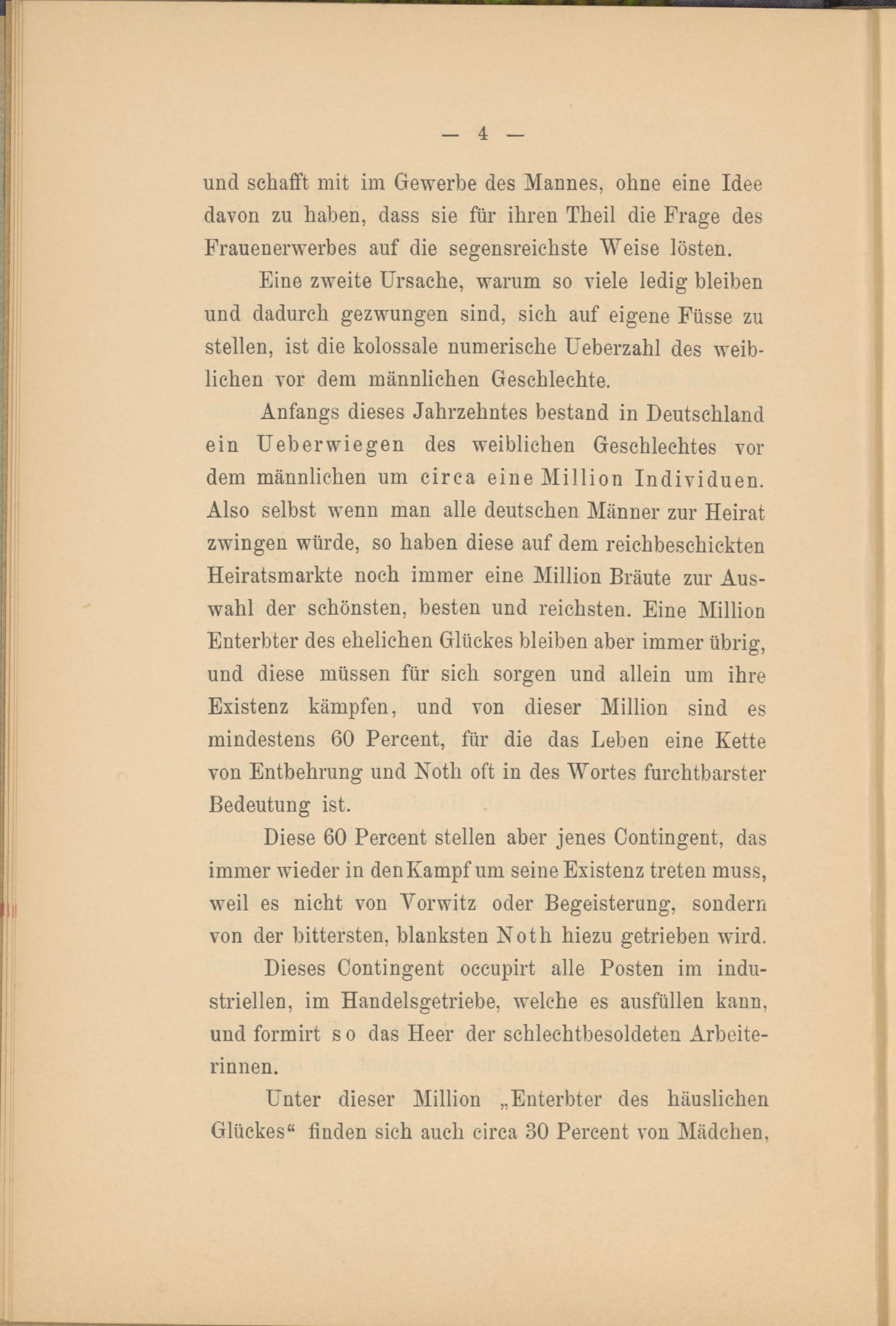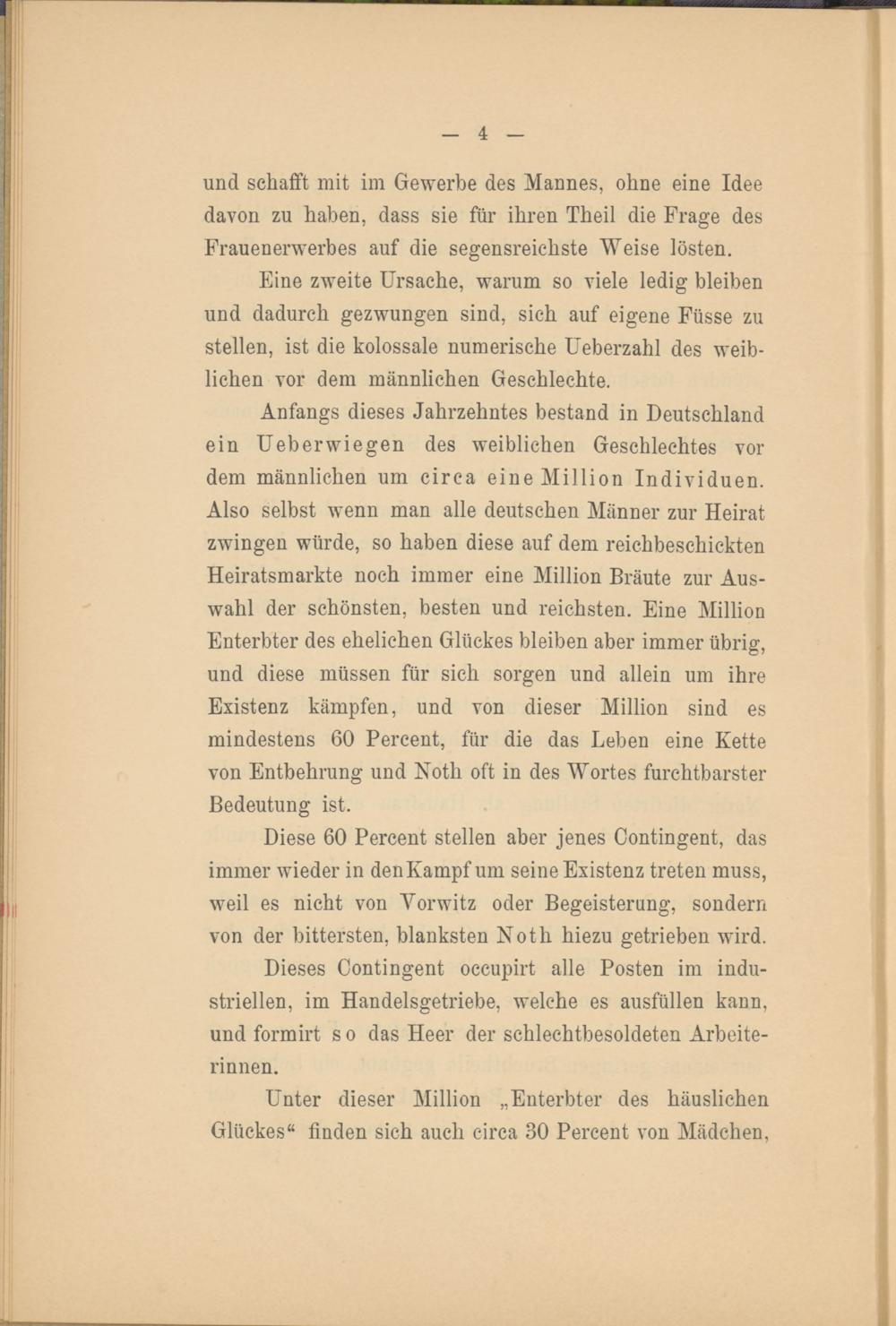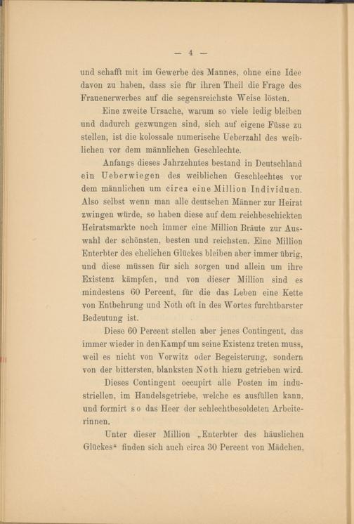 Anfangs dieses Jahrzehntes bestand in Deutschland ein Ueberwiegen des weiblichen Geschlechtes vor dem männlichen um circa eine Million Individuen. Also selbst wenn man alle deutschen Männer zur Heirat zwingen würde, so haben diese auf dem reichbeschickten Heiratsmarkte noch immer eine Million Bräute zur Auswahl der schönsten, besten und reichsten. Eine Million Enterbter des ehelichen Glückes bleiben aber immer übrig, und diese müssen für sich sorgen und allein um ihre Existenz kämpfen, und von dieser Million sind es mindestens 60 Percent, für die das Leben eine Kette von Entbehrung und Noth oft in des Wortes furchtbarster Bedeutung ist.