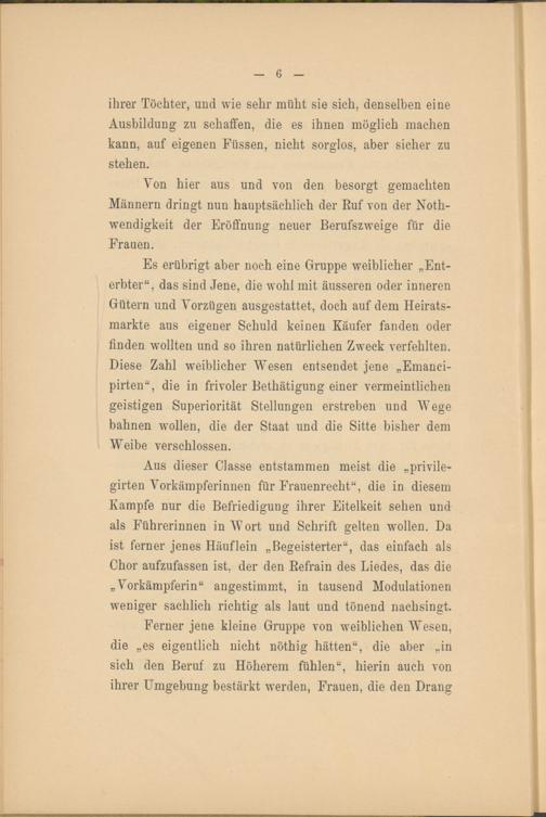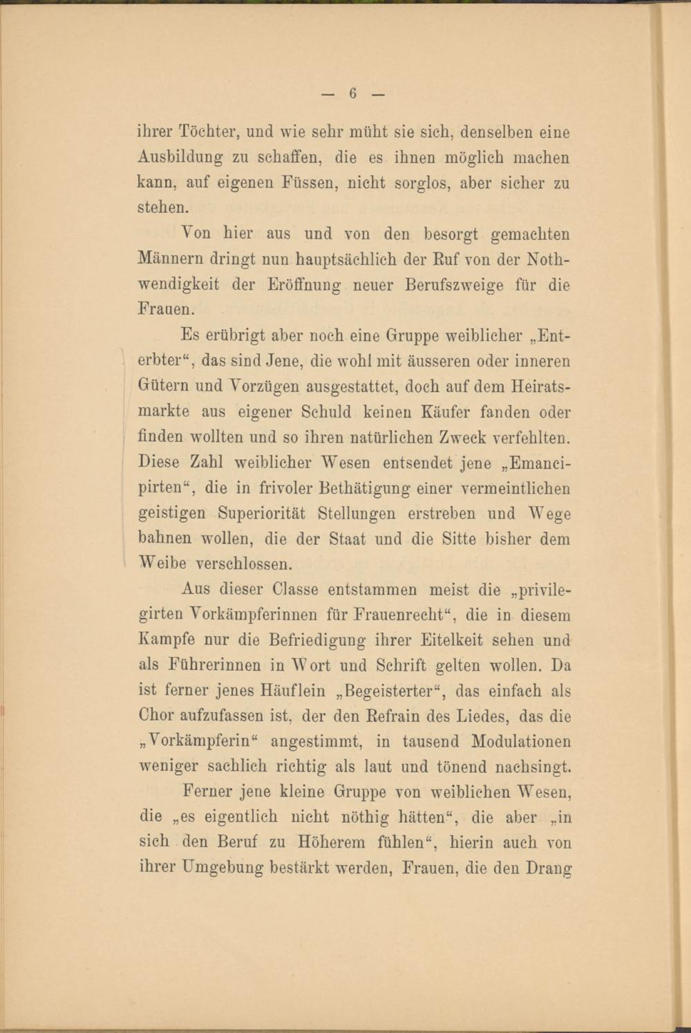 Es erübrigt aber noch eine Gruppe weiblicher „Enterbter“, das sind Jene, die wohl mit äusseren oder inneren Gütern und Vorzügen ausgestattet, doch auf dem Heiratsmarkte aus eigener Schuld keinen Käufer fanden oder finden wollten und so ihren natürlichen Zweck verfehlten. Diese Zahl weiblicher Wesen entsendet jene „Emanci- pirten“, die in frivoler Bethätigung einer vermeintlichen geistigen Superiorität Stellungen erstreben und Wege bahnen wollen, die der Staat und die Sitte bisher dem Weibe verschlossen.