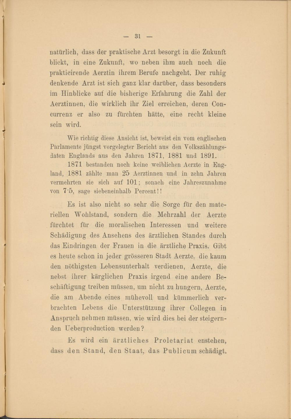 Es ist also nicht so sehr die Sorge für den mate­riellen Wohlstand, sondern die Mehrzahl der Aerzte fürchtet für die moralischen Interessen und weitere Schädigung des Ansehens des ärztlichen Standes durch das Eindringen der Frauen in die ärztliche Praxis. Gibt es heute schon in jeder grösseren Stadt Aerzte. die kaum den nöthigsten Lebensunterhalt verdienen, Aerzte, die nebst ihrer kärglichen Praxis irgend eine andere Be­schäftigung treiben müssen, um nicht zu hungern, Aerzte, die am Abende eines mühevoll und kümmerlich ver­brachten Lebens die Unterstützung ihrer Collegen in Anspruch nehmen müssen, wie wird dies bei der steigern­den Ueberproduction werden?
