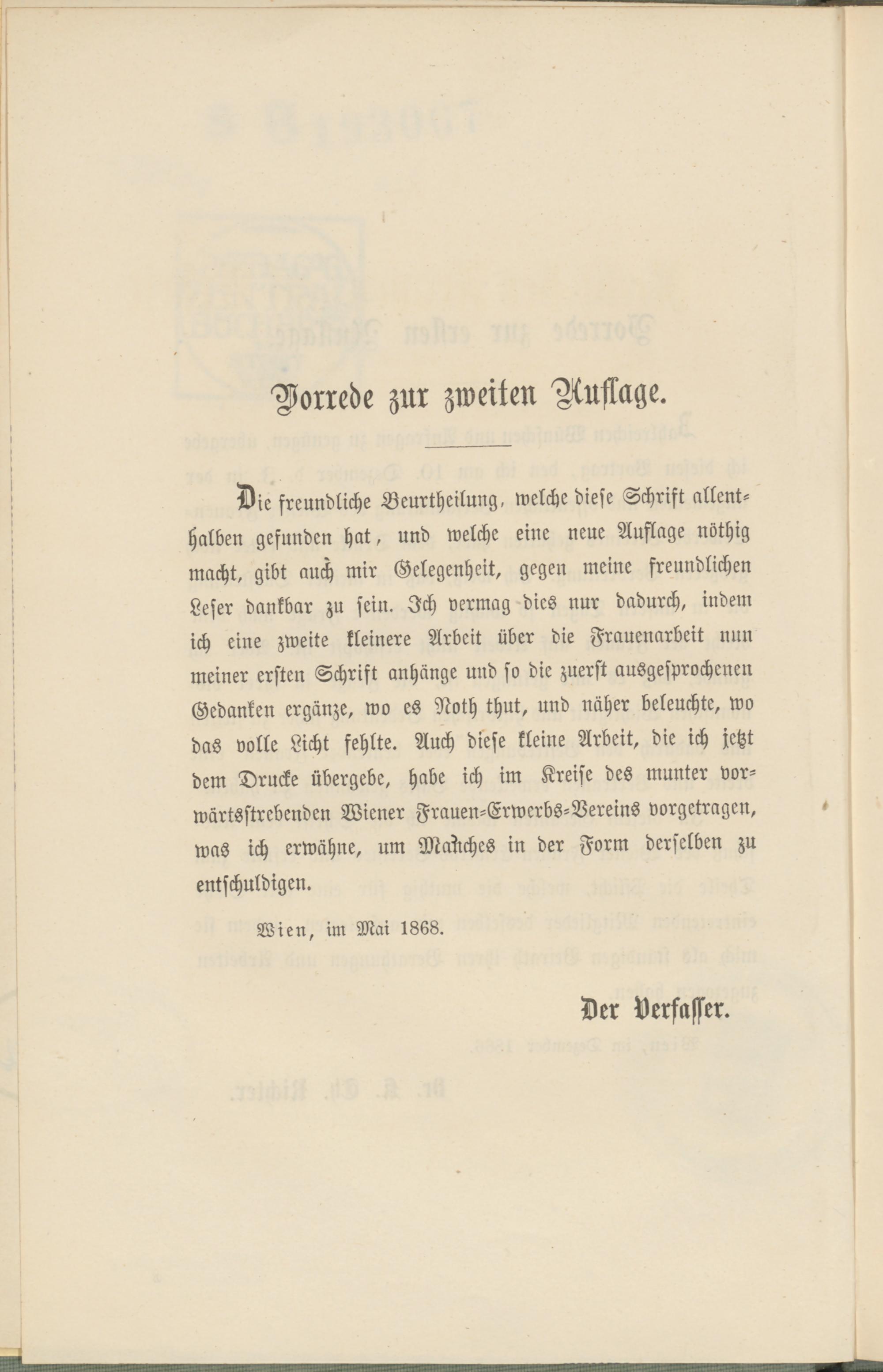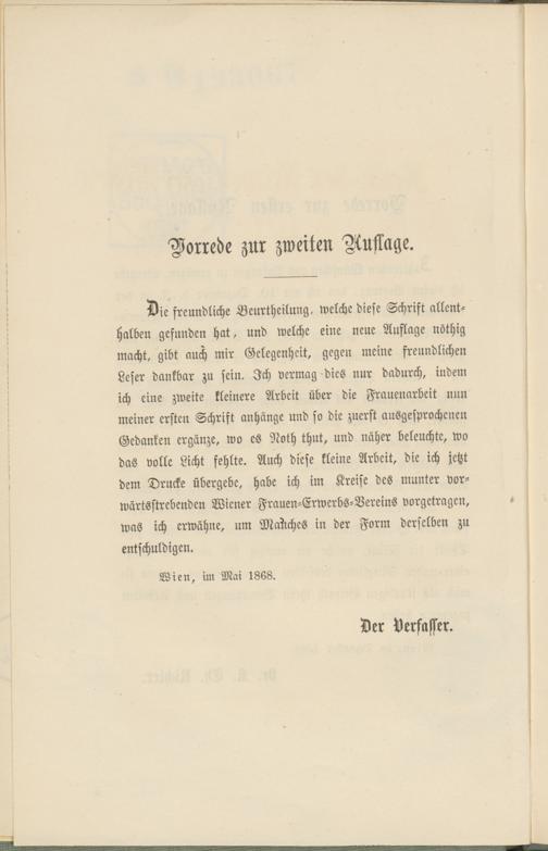 Äle freundliche Beurtheilung, welche diese Schrift nllent- halben gefunden hat, und welche eine neue Auflage nöthig macht, gibt auch mir Gelegenheit, gegen meine freundlichen Leser dankbar zu sein. Ich vermag dies nur dadurch, indem ich eine zweite kleinere Arbeit über die Frauenarbeit nun meiner ersten Schrift anhänge und so die zuerst ausgesprochenen Gedanken ergänze, wo es Noth thut, und näher beleuchte, wo das volle Licht fehlte. Auch diese kleine Arbeit, die ich jetzt dem Drucke übergebe, habe ich im Kreise des munter vor- wärtsstrebenden Wiener Frauen-Erwerbs-Vereins vorgetragen, was ich erwähne, um Manches in der Form derselben zu entschuldigen.