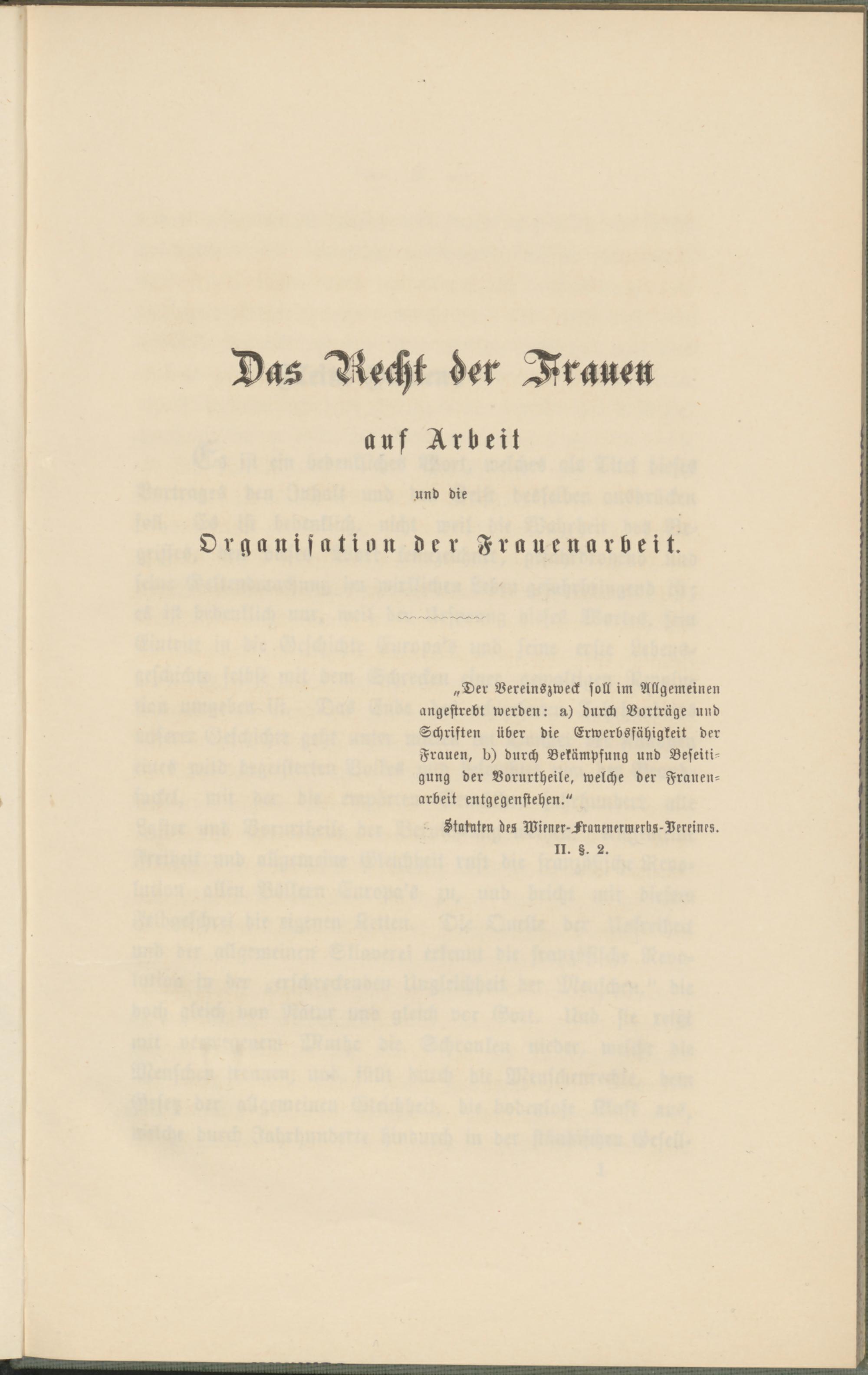 Der Bereinszweck soll im Allgemeinen angestrebt werden: u) durch Vortrage und Schriften über die Erwerbsfähigkeit der Frauen, d) durch Bekämpfung und Beseiti­gung der Vorurtheile, welche der Frauen­arbeit entgegenstehen."