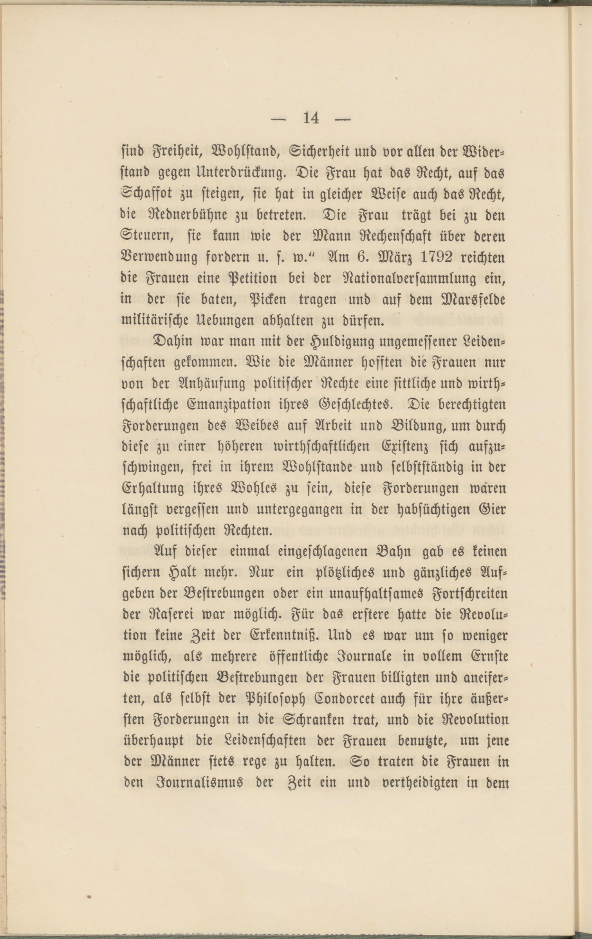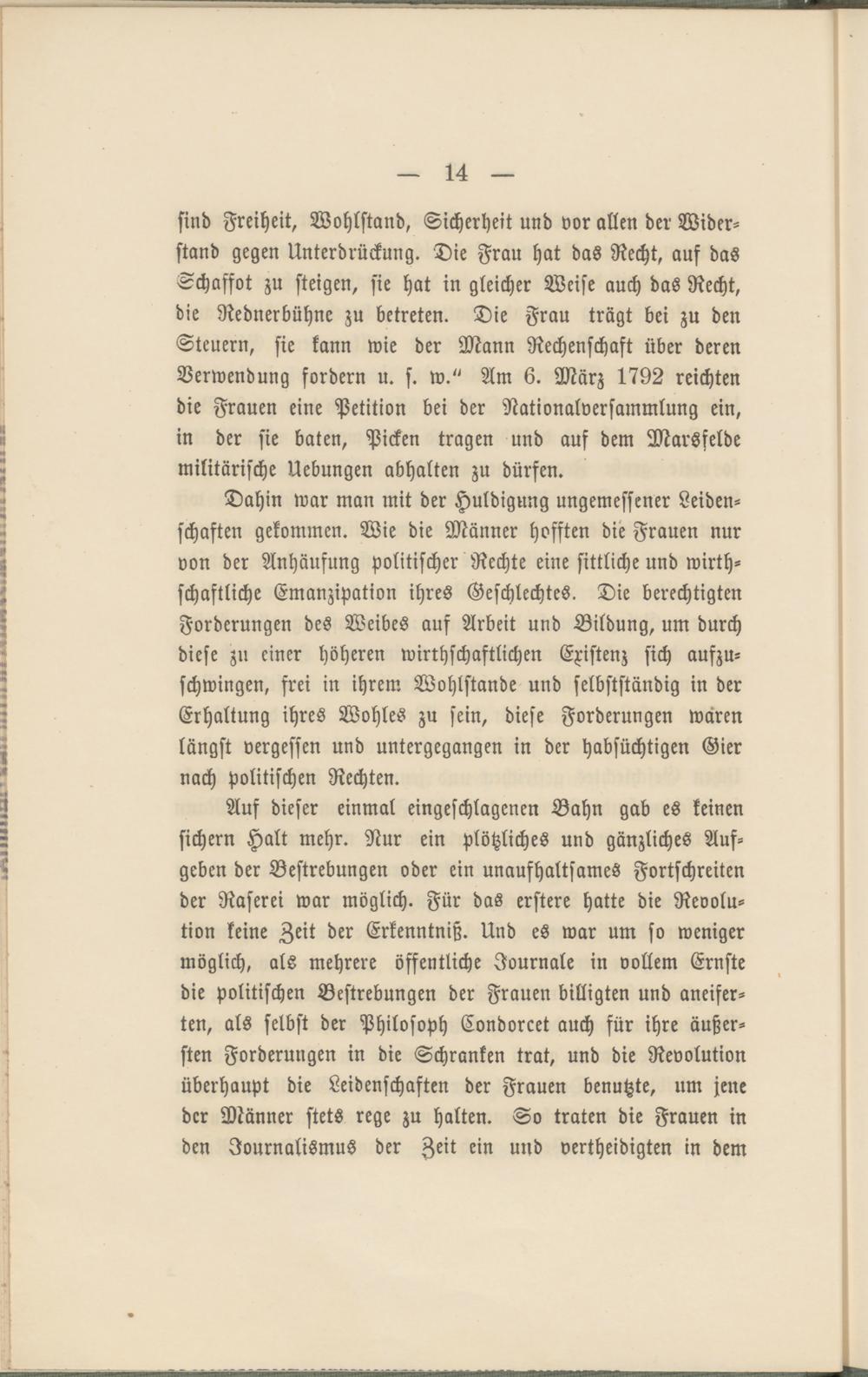 Auf dieser einmal eingeschlagenen Bahn gab es keinen sichern Halt mehr. Nur ein plötzliches und gänzliches Aufgeben der Bestrebungen oder ein unaufhaltsames Fortschreiten der Raserei war möglich. Für das erstere hatte die Revolution keine Zeit der Erkenntniß. Und es war um so weniger möglich, als mehrere öffentliche Journale in vollem Ernste die politischen Bestrebungen der Frauen billigten und aneifer- ten, als selbst der Philosoph Condorcet auch für ihre äußersten Forderungen in die Schranken trat, und die Revolution überhaupt die Leidenschaften der Frauen benutzte, um jene der Männer stets rege zu halten. So traten die Frauen in den Journalismus der Zeit ein und vertheidigten in dem