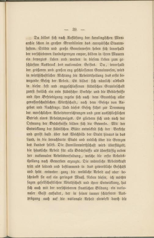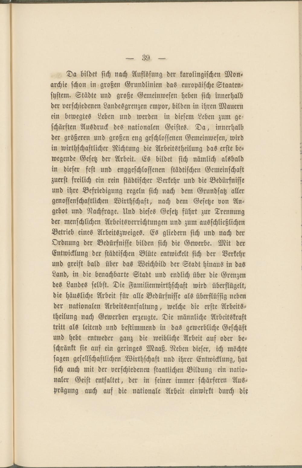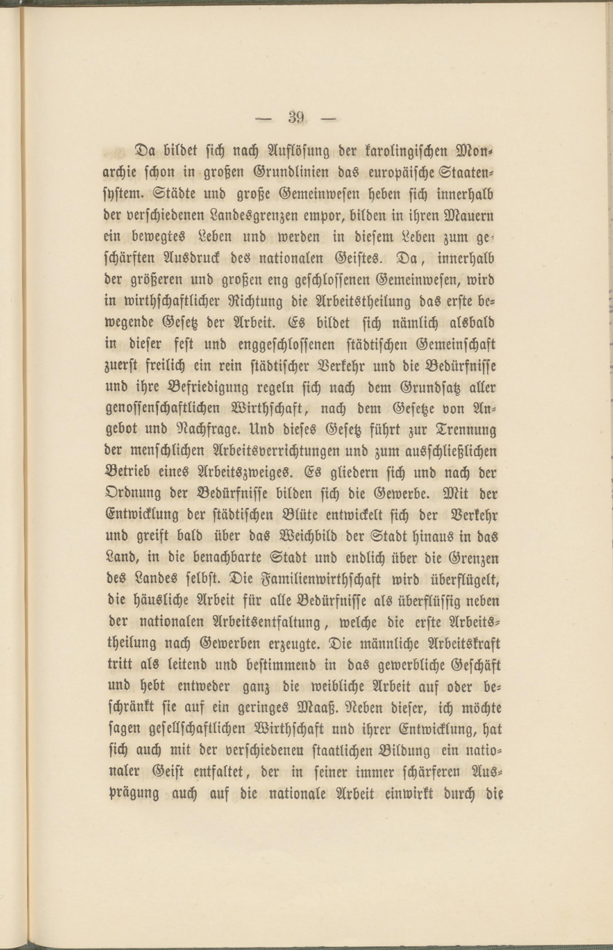 Da bildet sich nach Auflösung der karolingischen Monarchie schon in großen Grundlinien das europäische Staatensystem. Städte und große Gemeinwesen heben sich innerhalb der verschiedenen Landesgrenzen empor, bilden in ihren Mauern ein bewegtes Leben und werden in diesem Leben zum geschärften Ausdruck des nationalen Geistes. Da, innerhalb der größeren und großen eng geschlossenen Gemeinwesen, wird in wirtschaftlicher Richtung die Arbeitstheilung das erste bewegende Gesetz der Arbeit. Es bildet sich nämlich alsbald in dieser fest und enggeschlossenen städtischen Gemeinschaft zuerst freilich ein rein städtischer Verkehr und die Bedürfnisse und ihre Befriedigung regeln sich nach dem Grundsatz aller genossenschaftlichen Wirthschaft, nach dem Gesetze von Angebot und Nachfrage. Und dieses Gesetz führt zur Trennung der menschlichen Arbeitsverrichtungen und zum ausschließlichen Betrieb eines Arbeitszweiges. Es gliedern sich und nach der Ordnung der Bedürfnisse bilden sich die Gewerbe. Mit der Entwicklung der städtischen Blüte entwickelt sich der Verkehr und greift bald über das Weichbild der Stadt hinaus in das Land, in die benachbarte Stadt und endlich über die Grenzen des Landes selbst. Die Familienwirthschaft wird überflügelt, die häusliche Arbeit für alle Bedürfnisse als überflüssig neben der nationalen Arbeitsentfaltung, welche die erste Arbeitstheilung nach Gewerben erzeugte. Die männliche Arbeitskraft tritt als leitend und bestimmend in das gewerbliche Geschäft und hebt entweder ganz die weibliche Arbeit auf oder beschränkt sie auf ein geringes Maaß. Neben dieser, ich möchte sagen gesellschaftlichen Wirthschaft und ihrer Entwicklung, hat sich auch mit der verschiedenen staatlichen Bildung ein nationaler Geist entfaltet, der in seiner immer schärferen Ausprägung auch aus die nationale Arbeit einwirkt durch die