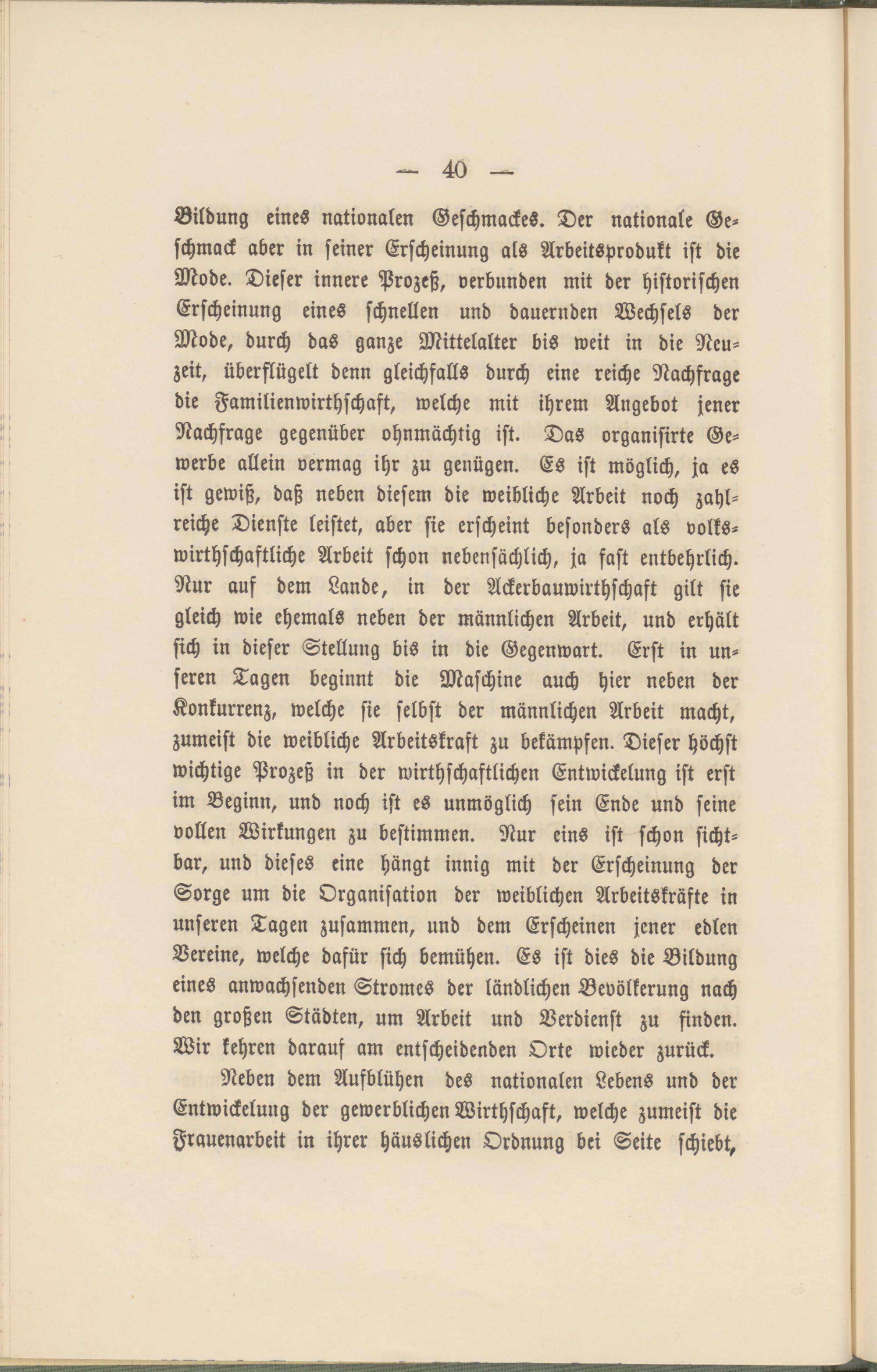 Bildung eines nationalen Geschmackes. Der nationale Geschmack aber in seiner Erscheinung als Arbeitsprodukt ist die Mode. Dieser innere Prozeß, verbunden mit der historischen Erscheinung eines schnellen und dauernden Wechsels der Mode, durch das ganze Mittelalter bis weit in die Neuzeit, überflügelt denn gleichfalls durch eine reiche Nachfrage die Familienwirthschaft, welche mit ihrem Angebot jener Nachfrage gegenüber ohnmächtig ist. Das organisirte Gewerbe allein vermag ihr zu genügen. Es ist möglich, ja es ist gewiß, daß neben diesem die weibliche Arbeit noch zahlreiche Dienste leistet, aber sie erscheint besonders als volks- wirthschastliche Arbeit schon nebensächlich, ja fast entbehrlich. Nur auf dem Lande, in der Ackerbauwirthschaft gilt sie gleich wie ehemals neben der männlichen Arbeit, und erhält sich in dieser Stellung bis in die Gegenwart. Erst in unseren Tagen beginnt die Maschine auch hier neben der Konkurrenz, welche sie selbst der männlichen Arbeit macht, zumeist die weibliche Arbeitskraft zu bekämpfen. Dieser höchst wichtige Prozeß in der wirtschaftlichen Entwickelung ist erst im Beginn, und noch ist es unmöglich sein Ende und seine vollen Wirkungen zu bestimmen. Nur eins ist schon sichtbar, und dieses eine hängt innig mit der Erscheinung der Sorge um die Organisation der weiblichen Arbeitskräfte in unseren Tagen zusammen, und dem Erscheinen jener edlen Vereine, welche dafür sich bemühen. Es ist dies die Bildung eines anwachsenden Stromes der ländlichen Bevölkerung nach den großen Städten, um Arbeit und Verdienst zu finden. Wir kehren daraus am entscheidenden Orte wieder zurück.