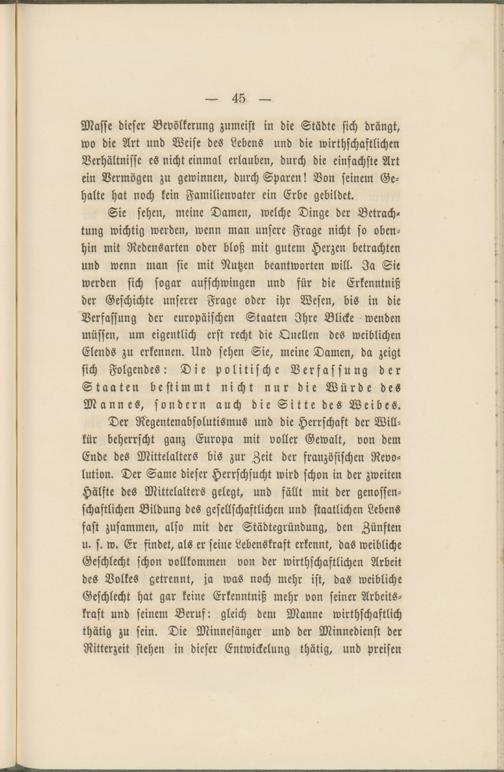 Sie sehen, meine Damen, welche Dinge der Betrachtung wichtig werden, wenn man unsere Frage nicht so obenhin mit Redensarten oder bloß mit gutem Herzen betrachten und wenn man sie mit Nutzen beantworten will. Ja Sie werden sich sogar aufschwingen und für die Erkenntniß der Geschichte unserer Frage oder ihr Wesen, bis in die Verfassung der europäischen Staaten Ihre Blicke-wenden müssen, um eigentlich erst recht die Quellen des weiblichen Elends zu erkennen. Und sehen Sie, meine Damen, da zeigt sich Folgendes: Die politische Verfassung der Staaten bestimmt nicht nur die Würde des Mannes, sondern auch die Sitte des Weibes.