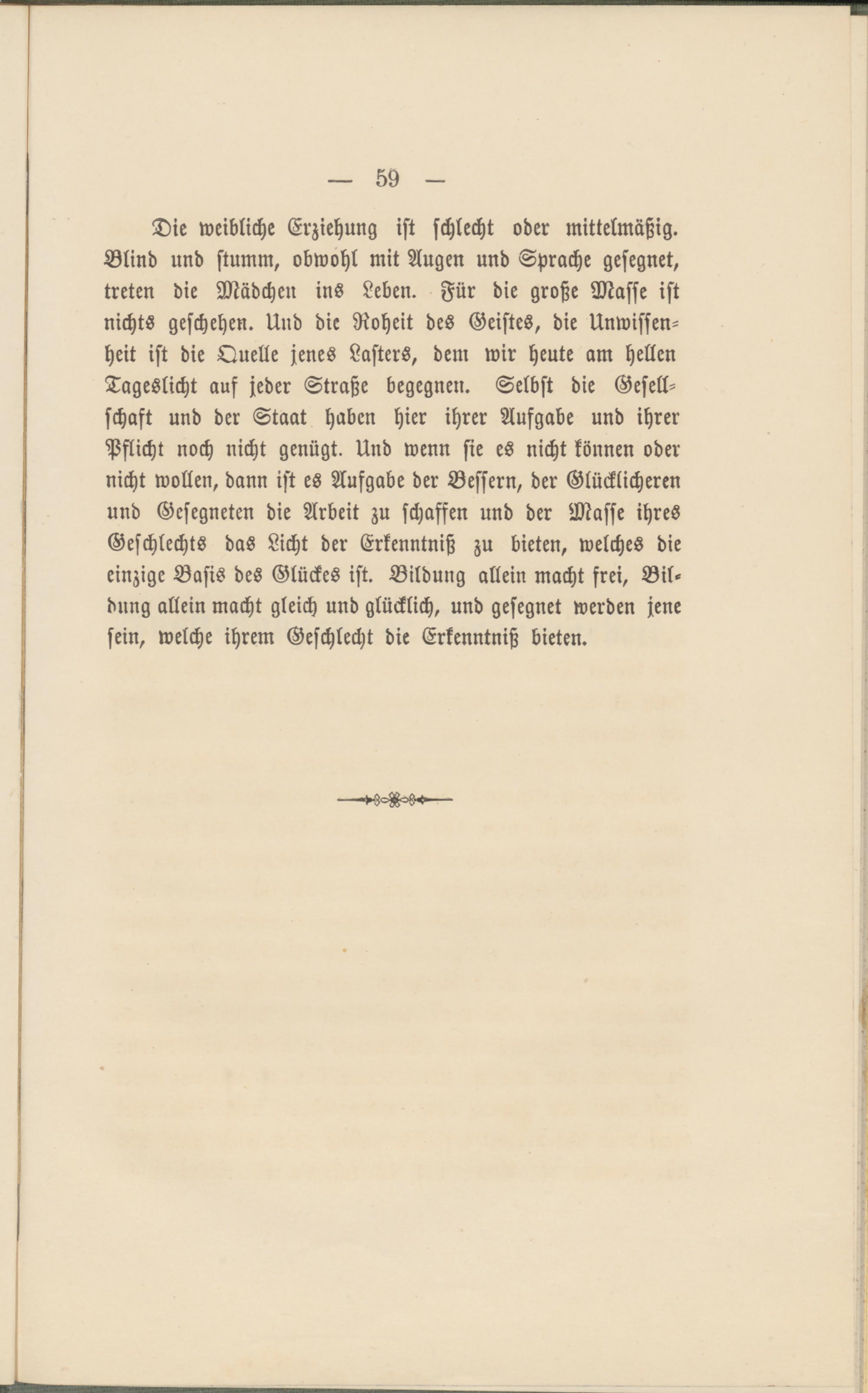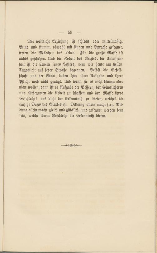 Die weibliche Erziehung ist schlecht oder mittelmäßig. Blind und stumm, obwohl mit Augen und Sprache gesegnet, treten die Mädchen ins Leben. Für die große Masse ist nichts geschehen. Und die Roheit des Geistes, die Unwissen­heit ist die Quelle jenes Lasters, dem wir heute am hellen Tageslicht auf jeder Straße begegnen. Selbst die Gesell­schaft und der Staat haben hier ihrer Aufgabe und ihrer Pflicht noch nicht genügt. Und wenn sie es nicht können oder nicht wollen, dann ist es Aufgabe der Bessern, der Glücklicheren und Gesegneten die Arbeit zu schaffen und der Masse ihres Geschlechts das Licht der Erkenntniß zu bieten, welches die einzige Basis des Glückes ist. Bildung allein macht frei, Bil­dung allein macht gleich und glücklich, und gesegnet werden jene sein, welche ihrem Geschlecht die Erkenntniß bieten.
