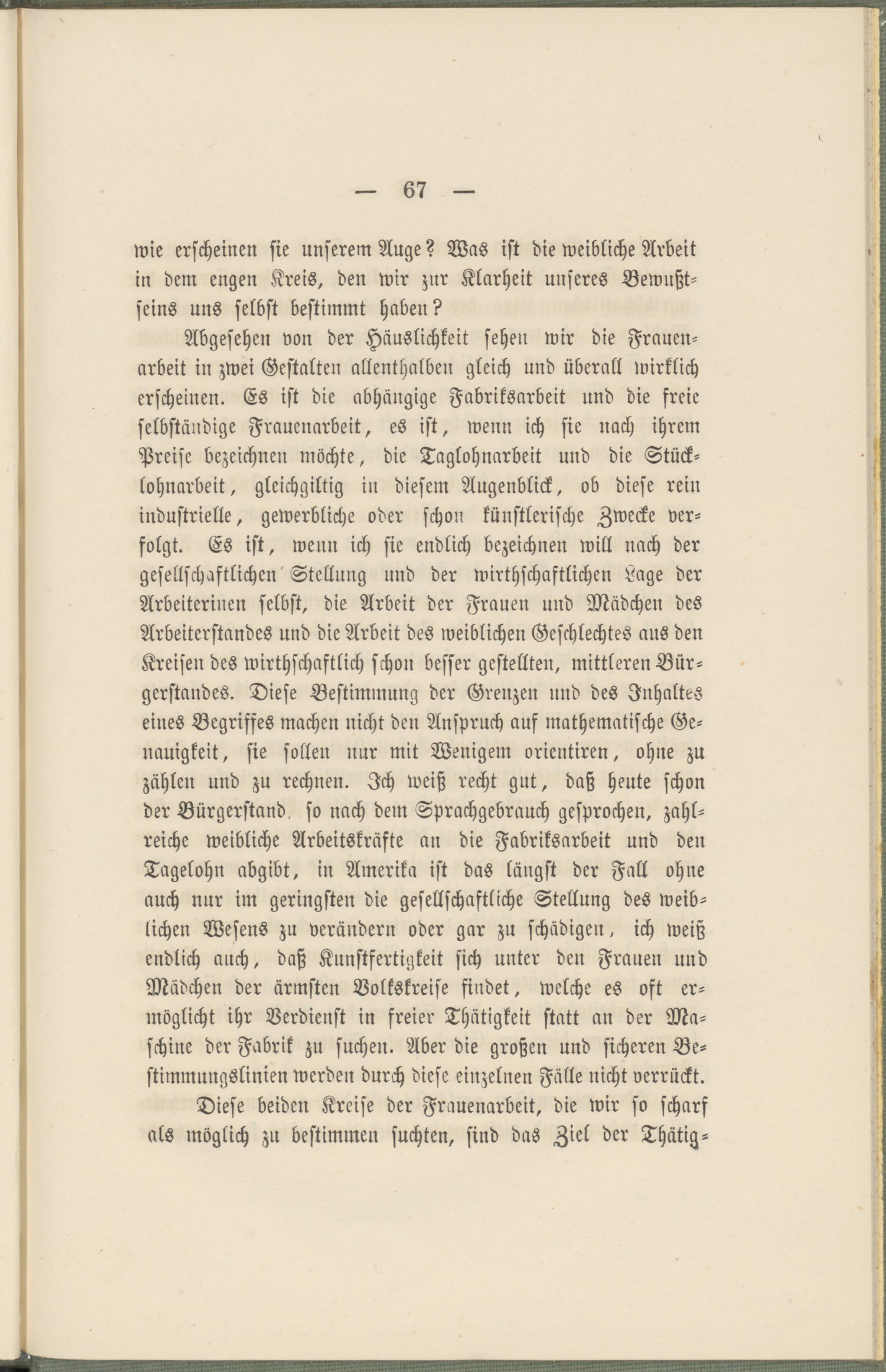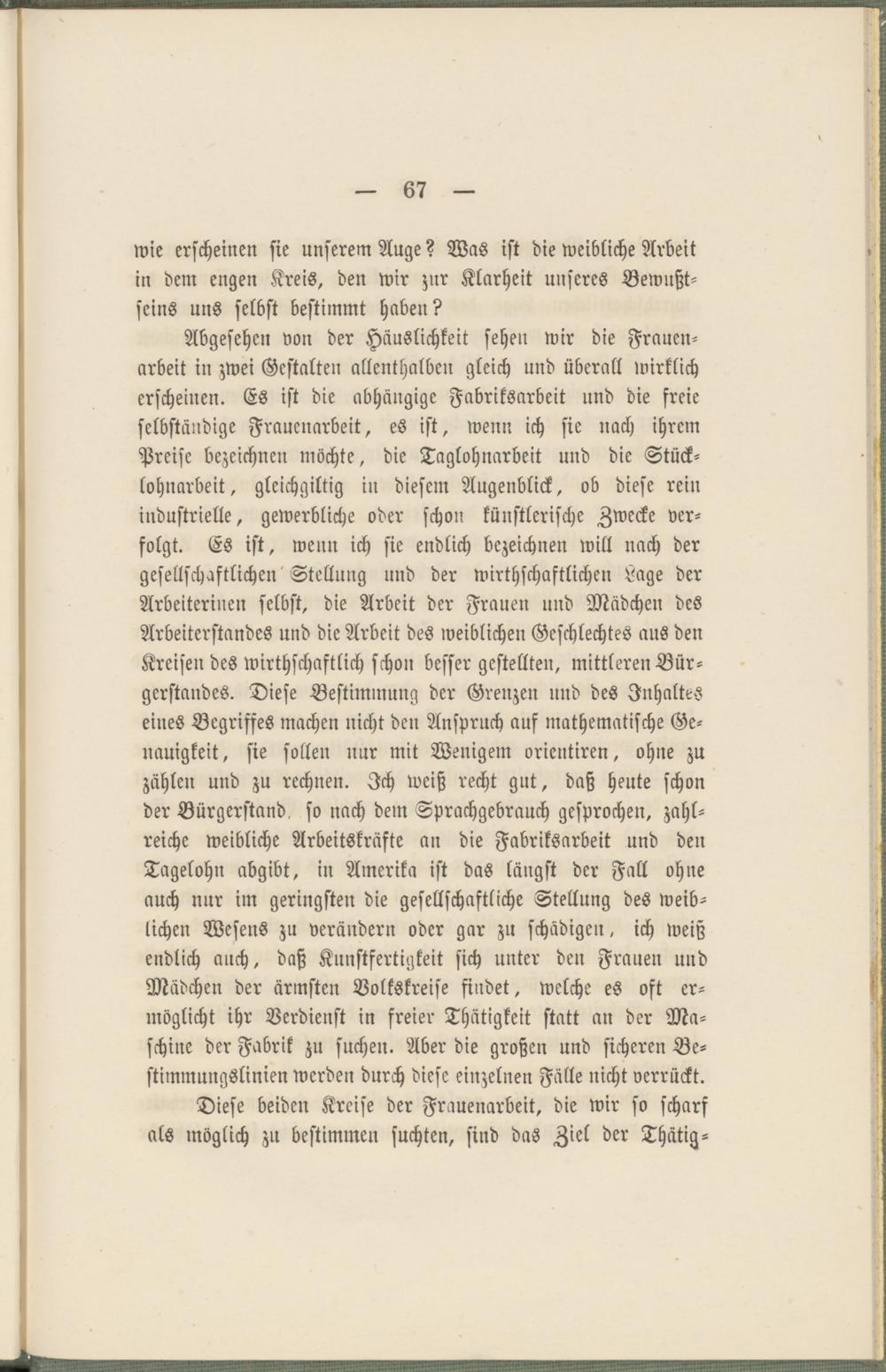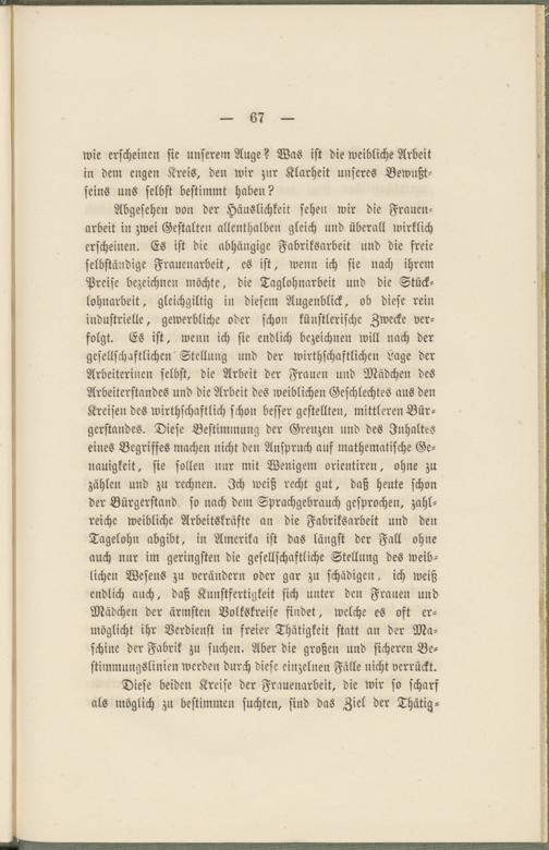 Abgesehen von der Häuslichkeit sehen wir die Frauenarbeit in zwei Gestalten allenthalben gleich und überall wirklich erscheinen. Es ist die abhängige Fabriksarbeit und die freie selbständige Frauenarbeit, es ist, wenn ich sie nach ihrem Preise bezeichnen möchte, die Taglohnarbeit und die Stücklohnarbeit, gleichgiltig in diesem Augenblick, ob diese rein industrielle, gewerbliche oder schon künstlerische Zwecke verfolgt. Es ist, wenn ich sie endlich bezeichnen will nach der gesellschaftlichen Stellung und der wirtschaftlichen Lage der Arbeiterinen selbst, die Arbeit der Frauen und Mädchen des Arbeiterstandes und die Arbeit des weiblichen Geschlechtes aus den Kreisendes wirtschaftlich schon besser gestellten, mittleren Bürgerstandes. Diese Bestimmung der Grenzen und des Inhaltes eines Begriffes machen nicht den Anspruch auf mathematische Genauigkeit, sie sollen nur mit Wenigem orientiren, ohne zu zählen und zu rechnen. Ich weiß recht gut, daß heute schon der Bürgerstand, so nach dem Sprachgebrauch gesprochen, zahlreiche weibliche Arbeitskräfte an die Fabriksarbeit und den Tagelohn abgibt, in Amerika ist das längst der Fall ohne auch nur im geringsten die gesellschaftliche Stellung des weiblichen Wesens zu verändern oder gar zu schädigen, ich weiß endlich auch, daß Kunstfertigkeit sich unter den Frauen und Mädchen der ärmsten Volkskreise findet, welche es oft ermöglicht ihr Verdienst in freier Thätigkeit statt an der Maschine der Fabrik zu suchen. Aber die großen und sicheren Bestimmungslinien werden durch diese einzelnen Fälle nicht verrückt.
