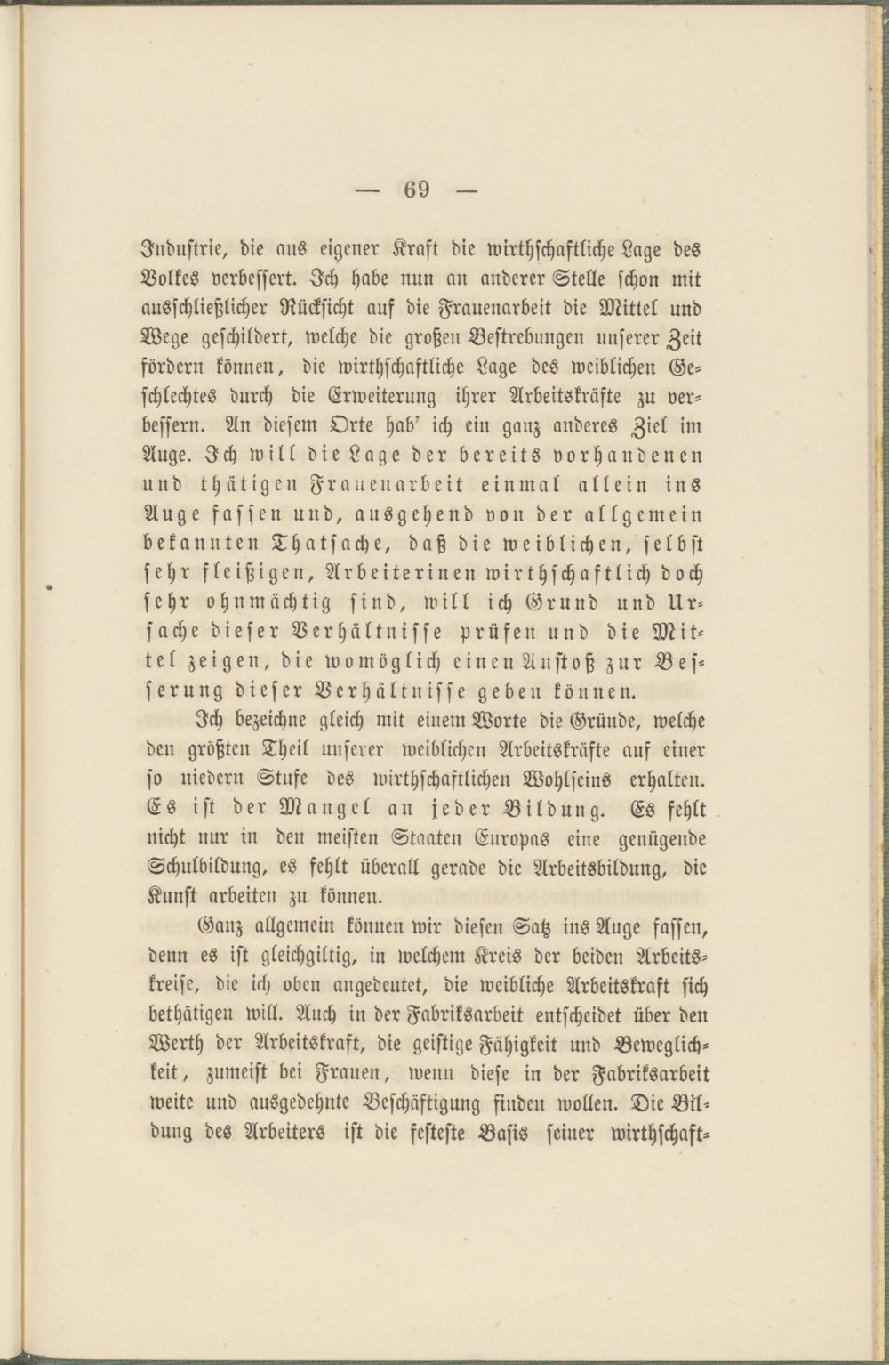 Ich bezeichne gleich mit einem Worte die Gründe, welche den größten Theil unserer weiblichen Arbeitskräfte auf einer so niedern Stufe des wirthschaftlicheu Wohlseins erhalten. Es ist der Mangel an jeder Bildung. Es fehlt nicht nur in den meisten Staaten Europas eine genügende Schulbildung, es fehlt überall gerade die Arbeitsbildung, die Kunst arbeiten zu können.