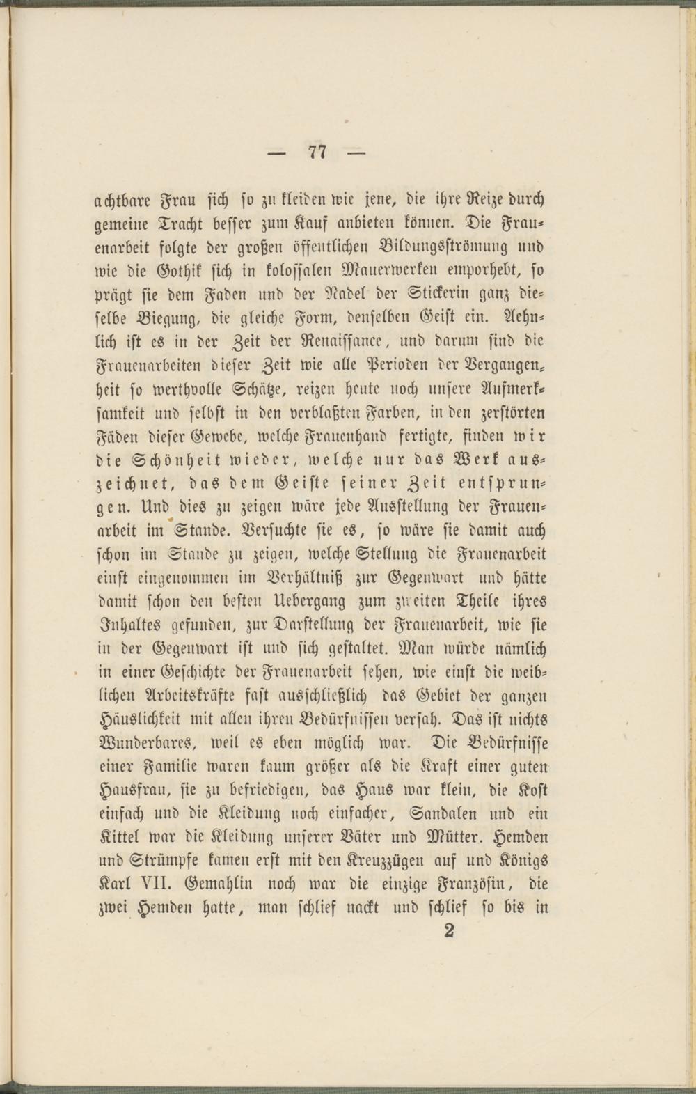 achtbare Frau sich so zu kleiden wie jene, die ihre Reize durch gemeine Tracht besser zum Kauf anbieten können. Die Frauenarbeit folgte der großen öffentlichen Bildungsströmnng und wie die Gothik sich in kolossalen Manerwerken emporhebt, so prägt sie dem Faden und der Nadel der Stickerin ganz dieselbe Biegung, die gleiche Form, denselben Geist ein. Aehn- lich ist es in der Zeit der Renaissance, und darum sind die Frauenarbeiten dieser Zeit wie alle Perioden der Vergangenheit so werthvolle Schatze, reizen heute noch unsere Aufmerksamkeit und selbst in den verblaßten Farben, in den zerstörten Fäden dieser Gewebe, welche Franenhand fertigte, finden wir die Schönheit wieder, welche nur das Werk auszeichnet, das dem Geiste seiner Zeit entsprungen. Und dies zu zeigen wäre jede Ausstellung der Frauenarbeit im Stande. Versuchte sie es, so wäre sie damit auch schon im Stande zu zeigen, welche Stellung die Frauenarbeit einst eingenommen im Verhältniß zur Gegenwart und hätte damit schon den besten Uebergang zum zweiten Theile ihres Inhaltes gefunden, zur Darstellung der Frauenarbeit, wie sie in der Gegenwart ist und sich gestaltet. Man würde nämlich in einer Geschichte der Frauenarbeit sehen, wie einst die weiblichen Arbeitskräfte fast ausschließlich das Gebiet der ganzen Häuslichkeit mit allen ihren Bedürfnissen versah. Das ist nichts Wunderbares, weil es eben möglich war. Die Bedürfnisse einer Familie waren kaum größer als die Kraft einer guten Hausfrau, sie zu befriedigen, das Haus war klein, die Kost einfach und die Kleidung noch einfacher, Sandalen und ein Kittel war die Kleidung unserer Väter und Mütter. Hemden und Strümpfe kamen erst mit den Kreuzzügen auf und Königs Karl VII. Gemahlin noch war die einzige Französin, die zwei Hemden hatte, man schlief nackt und schlief so bis in