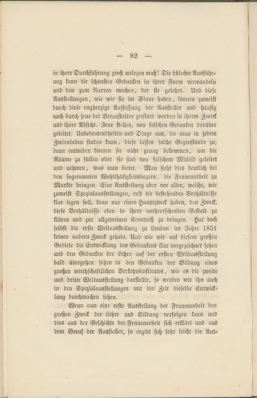 in ihrer Durchführung groß anlegen muß! Die schlechte Ausführ­ung kann die schönsten Gedanken in ihrer Form verwandeln und den zum Narren machen, der sie gelehrt. Und diese Ausstellungen, wie wir sie im Sinne haben, können zumeist durch diese engherzige Auffassung der Aussteller und häufig auch durch jene der Veranstalter zerstört werden in ihrem Zweck und ihrer Absicht. Jene stellen, von falschen Gedanken darüber geleitet, Unbedeutendheiten und Dinge aus, die man in jedem Zwirnladen finden kann, diese lassen solche Gegenstände zn, denn entweder können sie nicht genug bekommen, um die Räume zu füllen oder sie sind von falschem Mitleid geleitet und nehmen, was man bietet. Man sieht dies deutlich bei den sogenannten Wohlthütigkeitsbazars, die Frauenarbeit zu Markte bringen Eine Ausstellung aber vor allen, welche, wie zumeist Spezialausstellungen, erst die bestehenden Verhältnisse klar legen soll, kann nur einen Hauptzweck haben, den Zweck, diese Verhältnisse eben in ihrer vorherrschenden Gestalt zu klären und zur allgemeinen Kenntniß zu bringen. Hat doch selbst die erste Weltausstellung zu London im Jahre 1851 keinen andern Zweck gehabt. Und wie wir auf diesem großen Gebiete die Entwicklung des Gedankens klar vorgezeichnet sehen und den Gedanken der Lehre auf der ersten Weltausstellung bald übergehen sehen in den Gedanken der Bildung eines großen wirthschaftlichen Verkehrsinstitutes, wie es die zweite und dritte Weltausstellung darstellte, so werden wir ihn auch in den Spezialausstellungen mit der Zeit dieselbe Entwick­lung durchmachen sehen.