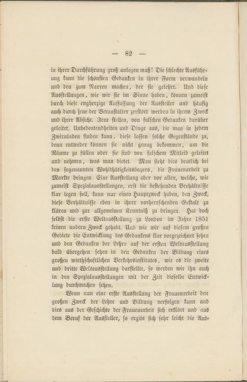 Wenn nun eine erste Ausstellung der Frauenarbeit den großen Zweck der Lehre und Bildung verfolgen kann und dies aus der Geschichte der Frauenarbeit sich erklärt und aus dem Beruf der Aussteller, so ergibt sich sehr leicht die Ant-
