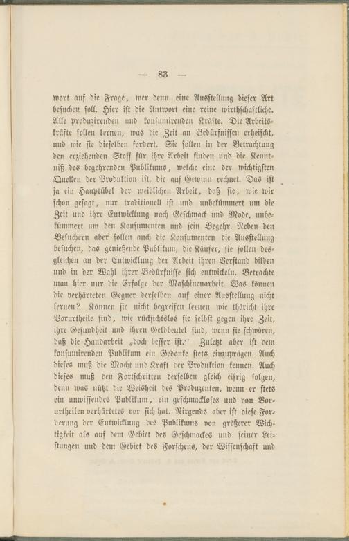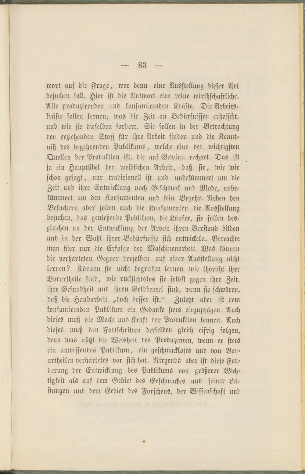 Wort auf die Frage, wer denn eine Ausstellung dieser Art besuchen soll. Hier ist die Antwort eine reine wirtschaftliche. Alle produzirenden und konsumirenden Kräfte. Die Arbeitskräfte sollen lernen, was die Zeit an Bedürfnissen erheischt, und wie sie dieselben fordert. Sie sollen in der Betrachtung den erziehenden Stoff für ihre Arbeit finden und die Kenntniß des begehrenden Publikums, welche eine der wichtigsten Quellen der Produktion ist, die auf Gewinn rechnet. Das ist ja ein Hauptübel der weiblichen Arbeit, daß sie, wie wir schon gesagt, nur traditionell ist und unbekümmert um die Zeit und ihre Entwicklung nach Geschmack und Mode, unbekümmert um den Konsumenten und sein Begehr. Neben den Besuchern aber sollen auch die Konsumenten die Ausstellung besuchen, das genießende Publikum, die Käufer, sie sollen desgleichen an der Entwicklung der Arbeit ihren Verstand bilden und in der Wahl ihrer Bedürfnisse sich entwickeln. Betrachte man hier nur die Erfolge der Maschinenarbeit Was können die verhärteten Gegner derselben auf einer Ausstellung nicht lernen? Können sie nicht begreifen lernen wie thöricht ihre Vorurtheile sind, wie rücksichtslos sie selbst gegen ihre Zeit, ihre Gesundheit und ihren Geldbeutel sind, wenn sie schwören, daß die Handarbeit „doch besser ist/' Zuletzt aber ist dem konsumirenden Publikum ein Gedanke stets einzuprägen. Auch dieses muß die Macht und Kraft der Produktion kennen. Auch dieses muß den Fortschritten derselben gleich eifrig folgen, denn was nützt die Weisheit des Produzenten, wenn-er stets ein unwissendes Publikum, ein geschmackloses und von Vor- urtheilen verhärtetes vor sich hat. Nirgends aber ist diese Forderung der Entwicklung des Publikums von größerer Wichtigkeit als auf dem Gebiet des Geschmackes und seiner Leistungen und dem Gebiet des Forschens, der Wissenschaft und