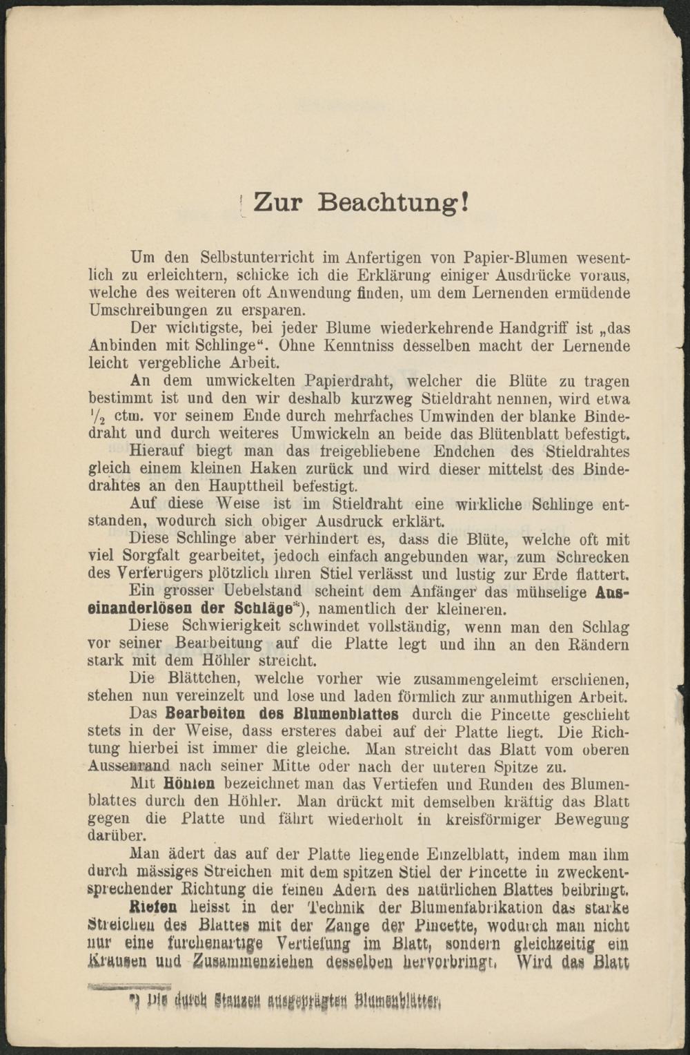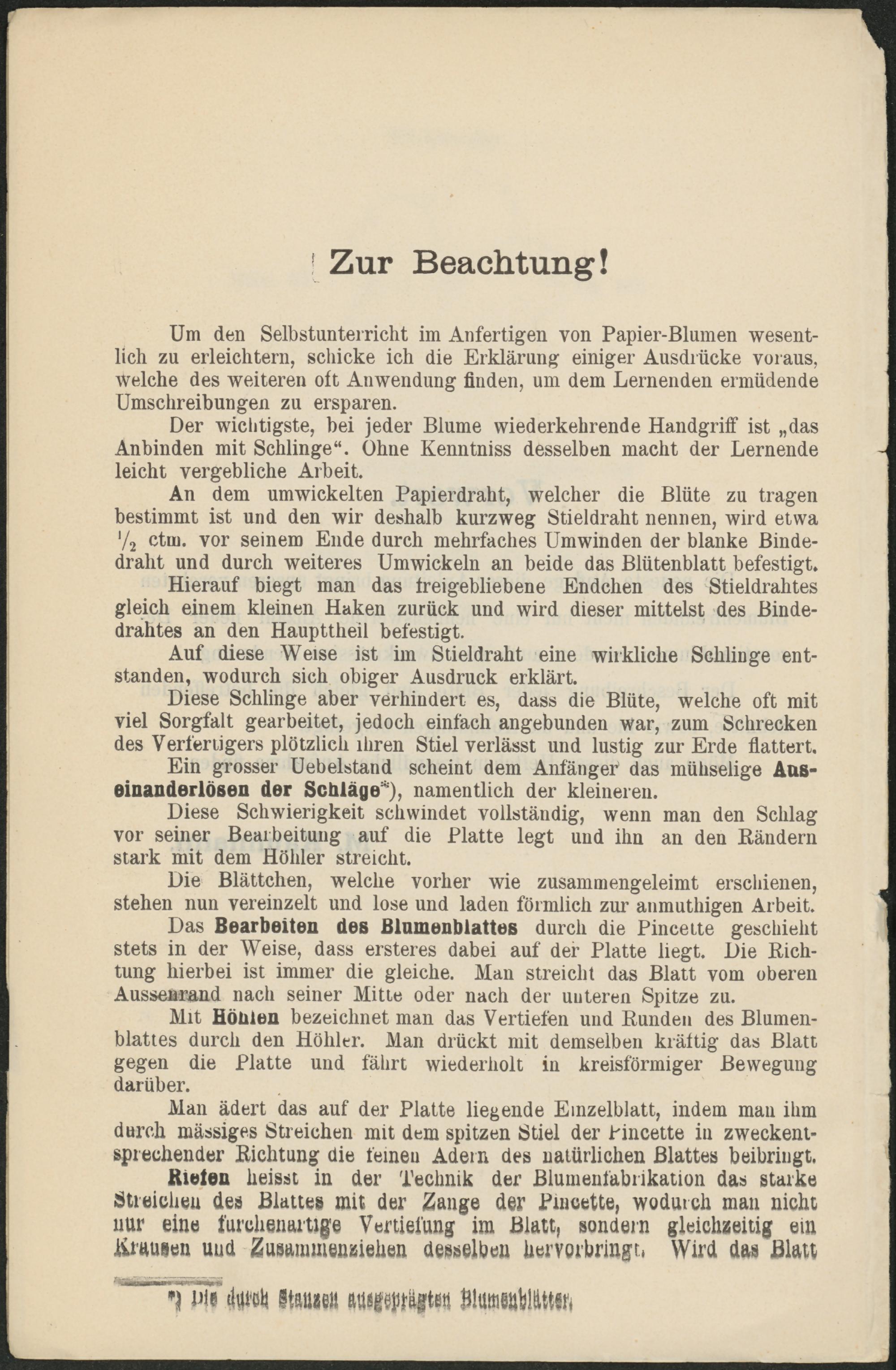 Um den Selbstunterricht im Anfertigen von Papier-Blumen wesentlich zu erleichtern, schicke ich die Erklärung einiger Ausdrücke voraus, welche des weiteren oft Anwendung finden, um dem Lernenden ermüdende Umschreibungen zu ersparen.