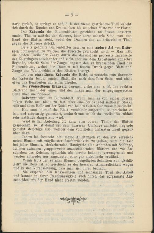 Das Kräuseln des Blumenblattes geschieht an dessen äusseren runden Theilen mittelst der Scheere, über deren scharfe Seite man den Rand des Blattes zieht, wobei der Daumen den zu kräuselnden Theil gegen die Scheere drückt.