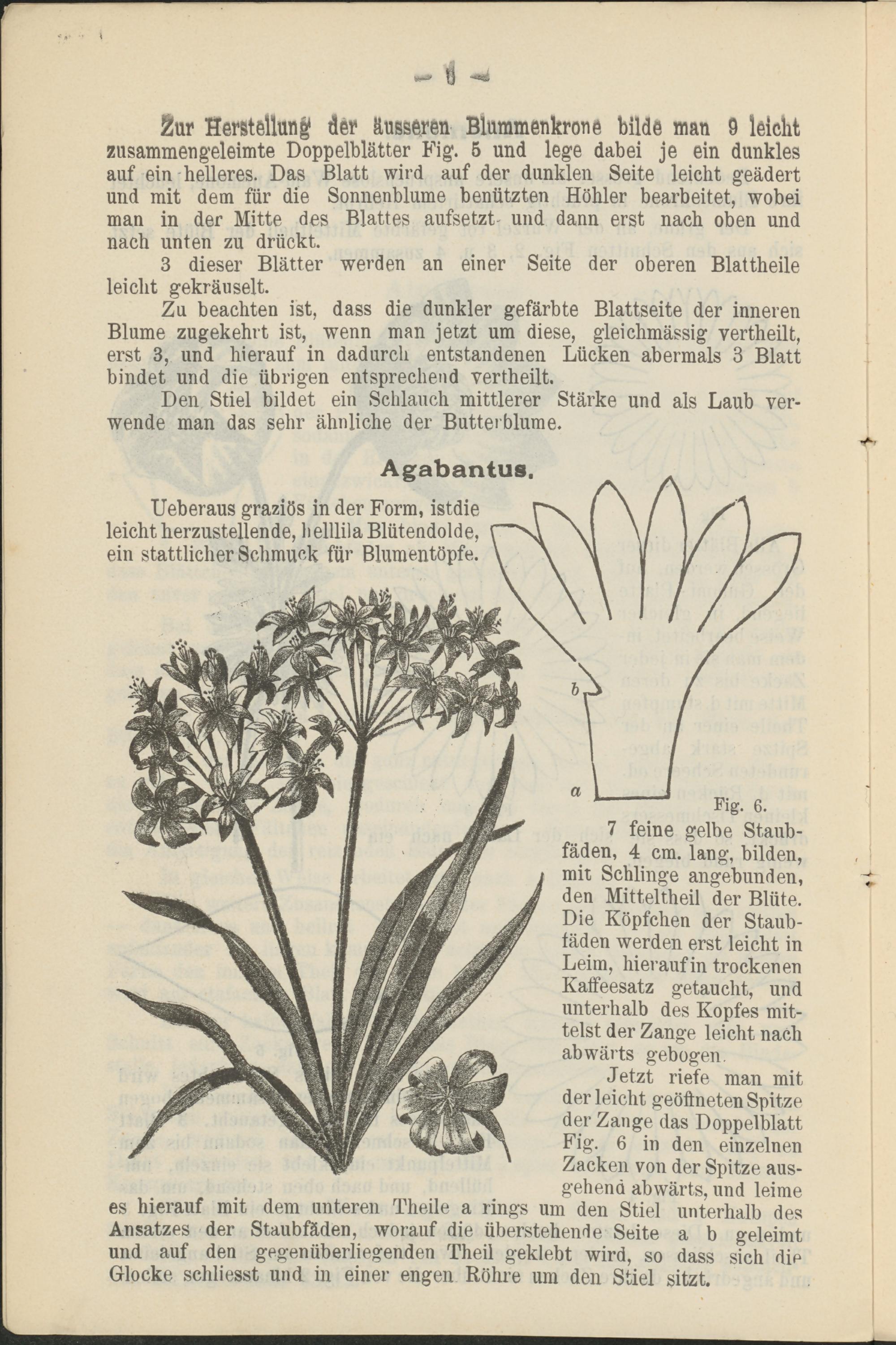 Jetzt riefe man mit der leicht geöffneten Spitze der Zange das Doppelblatt Fig. 6 in den einzelnen Zacken von der Spitze ausgehend abwärts, und leime es hierauf mit dem unteren Theile a rings um den Stiel unterhalb des Ansatzes der Staubfäden, worauf die überstellende Seite a b geleimt und auf den gegenüberliegenden Theil geklebt wird, so dass sich dip Glocke schliesst und in einer engen Röhre um den Stiel sitzt.