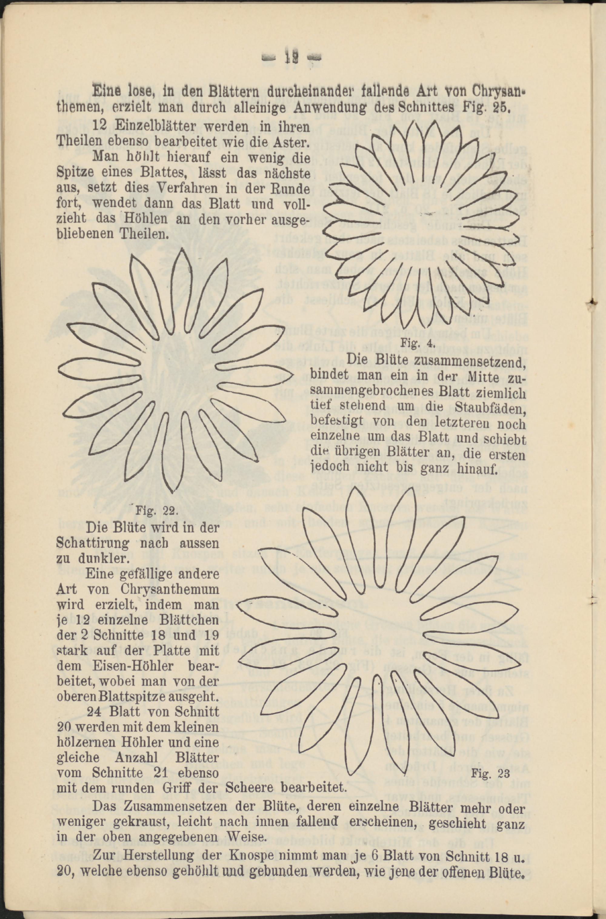 Eine gefällige andere Art von Chrysanthemum wird erzielt, indem man je 12 einzelne Blättchen der 2 Schnitte 18 und 19 stark auf der Platte mit dem Eisen-Höhler bearbeitet, wobei man von der oberen Blattspitze ausgeht.