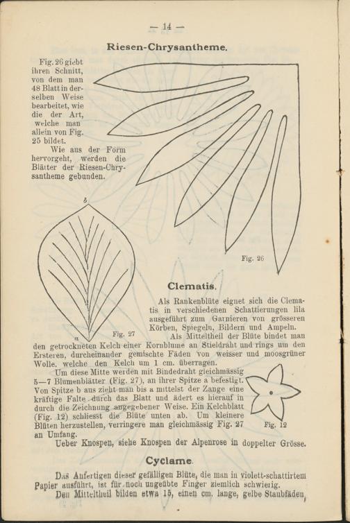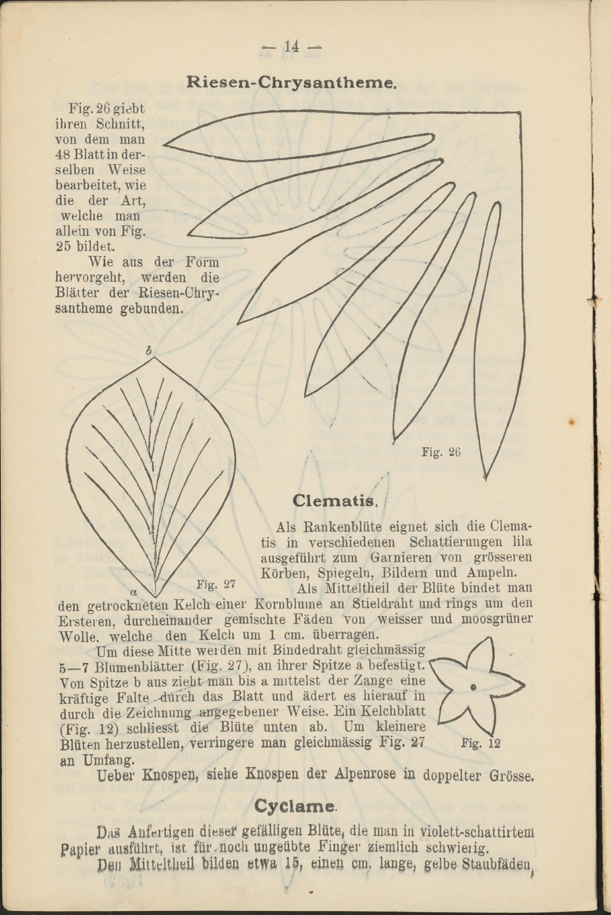 Von Spitze b aus zieht man bis a mittelst der Zange eine kräftige Falte --durch das Blatt und ädert es hierauf in durch die Zeichnung .angegebener Weise. Ein Kelchblatt (Fig. 12) schliesst die' Blüte unten ab. Um kleinere Blüten herzustellen, verringere man gleichmässig Fig. 27 an Umfang.