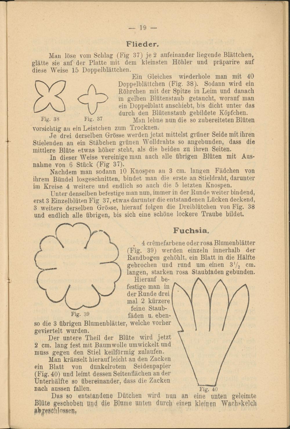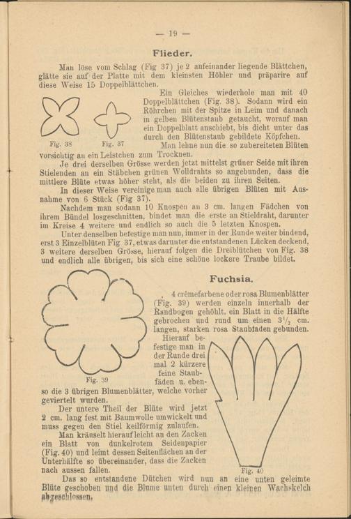 Ein Gleiches wiederhole man mit 40 Doppelblättchen (Fig. 38). Sodann wird ein Röhrchen mit der Spitze in Leim und danach in gelben Blutenstaub getaucht, worauf man ein Doppelblatt anschiebt, bis dicht unter das durch den Blutenstaub gebildete Köpfchen. Man lehne nun die so zubereiteten Blüten vorsichtig an ein Leistchen zum Trocknen.
