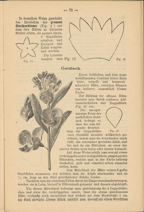 Die unregelmässige Form des natürlichen Goldlack bedingt es dass die nun folgende Bearbei- der Doppelblätt- Fig. 47 dien ebenfalls ziemlich willkürlich geschieht, indem man sie verschieden stark rieft, die schwächer gerieften höhlt, und hie und da ein Blättchen an einer der oberen Seiten nach innen oder aussen kräuselt.