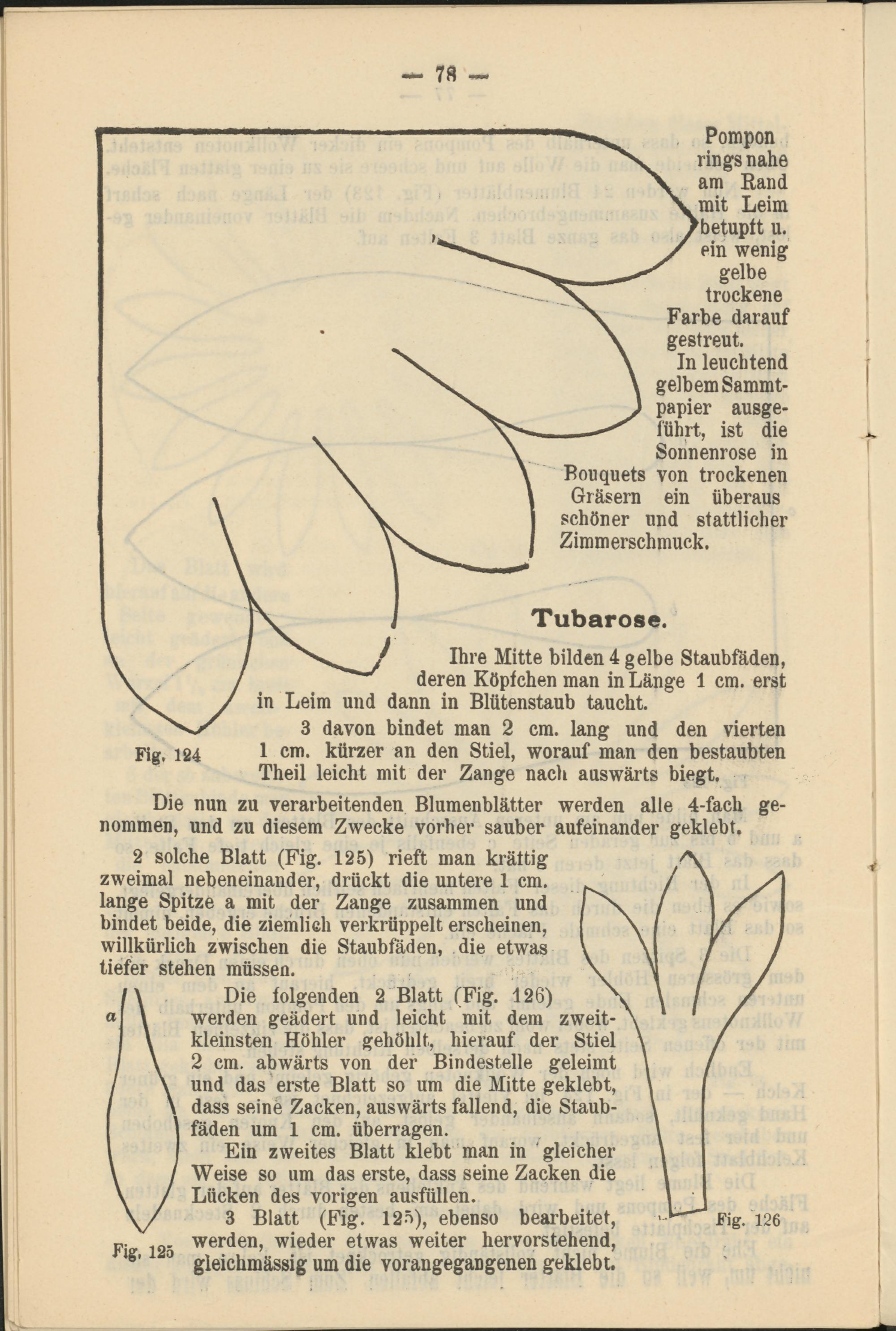 3 Blatt (Fig. 125), ebenso bearbeitet, werden, wieder etwas weiter hervorstehend, gleichmässig um die vorangegangenen geklebt.