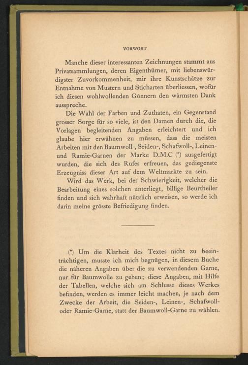 Die Wahl der Farben und Zuthaten, ein Gegenstand grosser Sorge für so viele, ist den Damen durch die, die Vorlagen begleitenden Angaben erleichtert und ich glaube hier erwähnen zu müssen, dass die meisten Arbeiten mit den Baumwoll-, Seiden-, Schafwoll-, Leinen- und Ramie-Garnen der Marke D.M.C (*) ausgefertigt wurden, die sich des Rufes erfreuen, das gediegenste Erzeugniss dieser Art auf dem Weltmärkte zu sein.