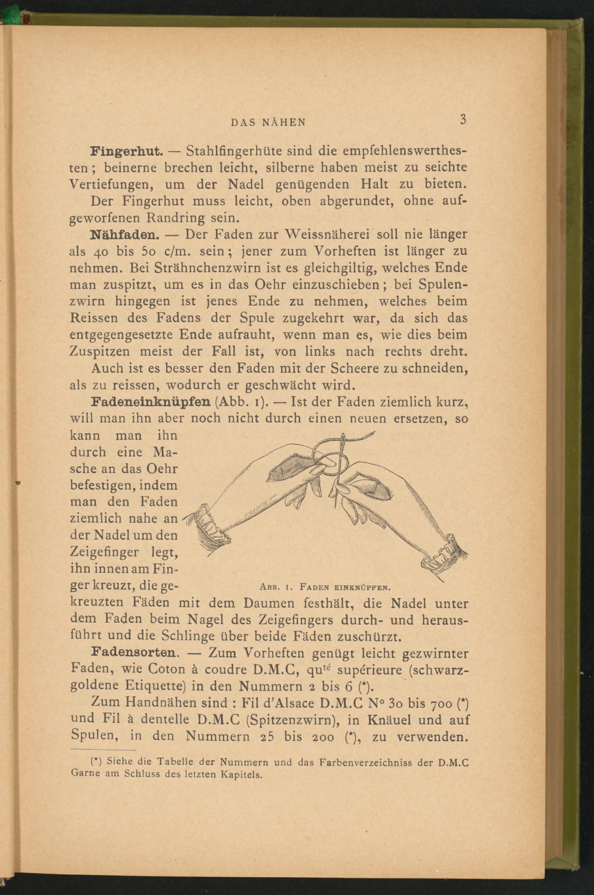 Fadeneinknüpfen (Abb. 1). — Ist der Faden ziemlich kurz, will man ihn aber noch nicht durch einen neuen ersetzen, so kann man ihn durch eine Masche an das Oehr befestigen, indem man den Faden ziemlich nahe an der Nadel um den Zeigefinger legt, ihn innen am Finger kreuzt, die ge- Abb. 1. Faden EINKNÜPFEN.