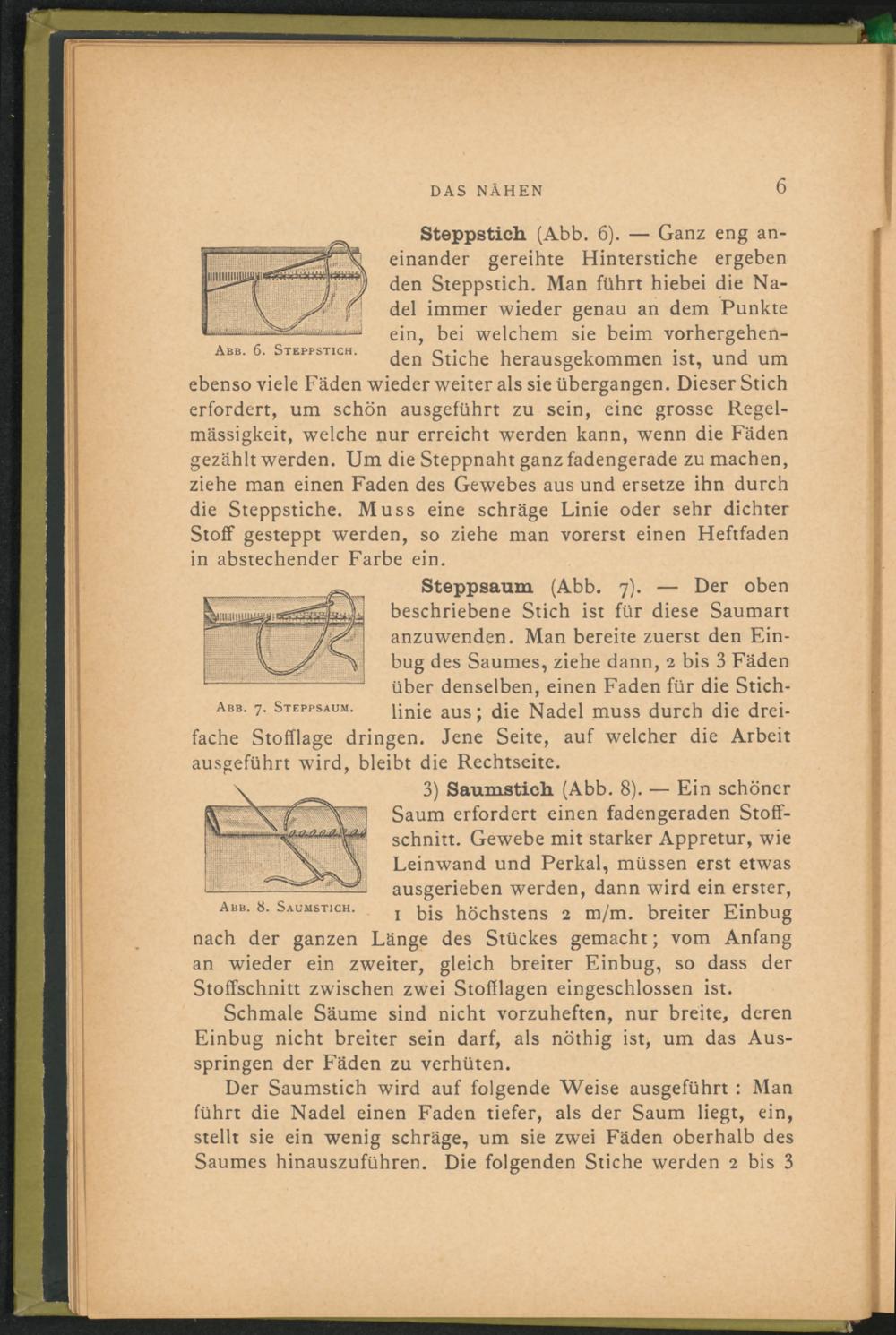 Steppstich (Abb. 6). — Ganz eng aneinander gereihte Hinterstiche ergeben den Steppstich. Man führt hiebei die Nadel immer wieder genau an dem Punkte ein, bei welchem sie beim vorhergehenden Stiche herausgekommen ist, und um ebenso viele Fäden wieder weiter als sie übergangen. Dieser Stich erfordert, um schön ausgeführt zu sein, eine grosse Regelmässigkeit, welche nur erreicht werden kann, wenn die Fäden gezählt werden. Um die Steppnaht ganz fadengerade zu machen, ziehe man einen Faden des Gewebes aus und ersetze ihn durch die Steppstiche. Muss eine schräge Linie oder sehr dichter Stoff gesteppt werden, so ziehe man vorerst einen Heftfaden in abstechender Farbe ein.