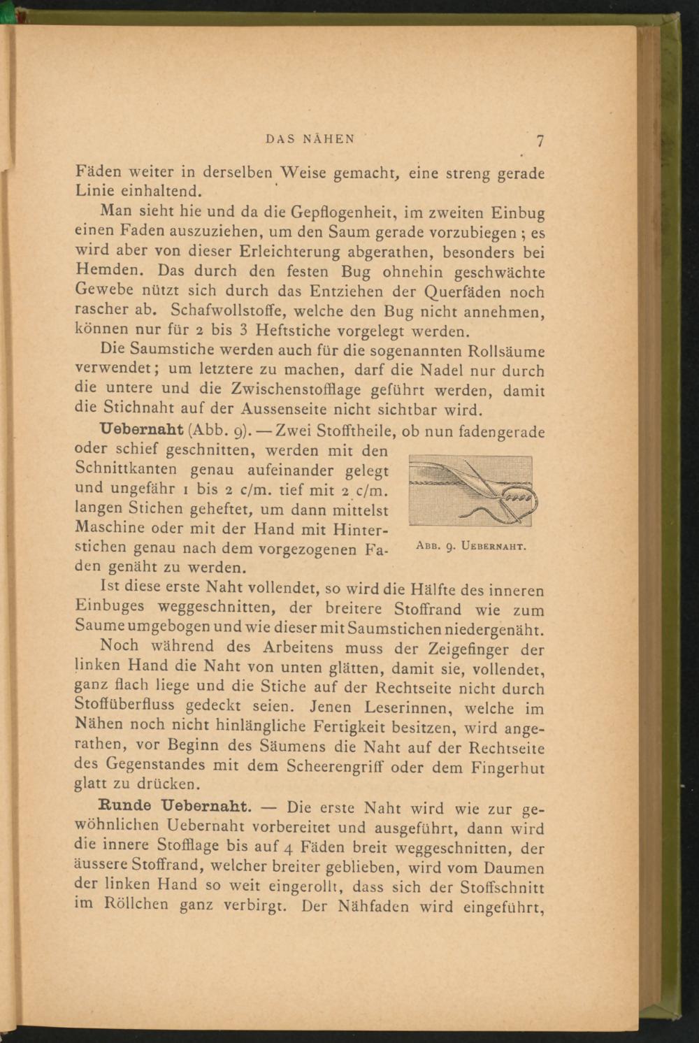 Noch während des Arbeitens muss der Zeigefinger der linken Hand die Naht von unten glätten, damit sie, vollendet, ganz flach liege und die Stiche auf der Rechtseite nicht durch Stoffüberfluss gedeckt seien. Jenen Leserinnen, welche im Nähen noch nicht hinlängliche Fertigkeit besitzen, wird ange- rathen, vor Beginn des Säumens die Naht auf der Rechtseite des Gegenstandes mit dem Scheerengriff oder dem Fingerhut glatt zu drücken.