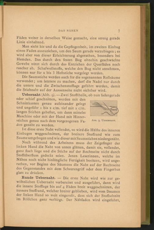 Runde Uebernaht. — Die erste Naht wird wie zur gewöhnlichen Uebernaht vorbereitet und ausgeführt, dann wird die innere Stofflage bis auf 4 Fäden breit weggeschnitten, der äussere Stoffrand, welcher breiter geblieben, wird vom Daumen der linken Hand so weit eingerollt, dass sich der Stoffschnitt im Röllchen ganz verbirgt. Der Nähfaden wird eingeführt,