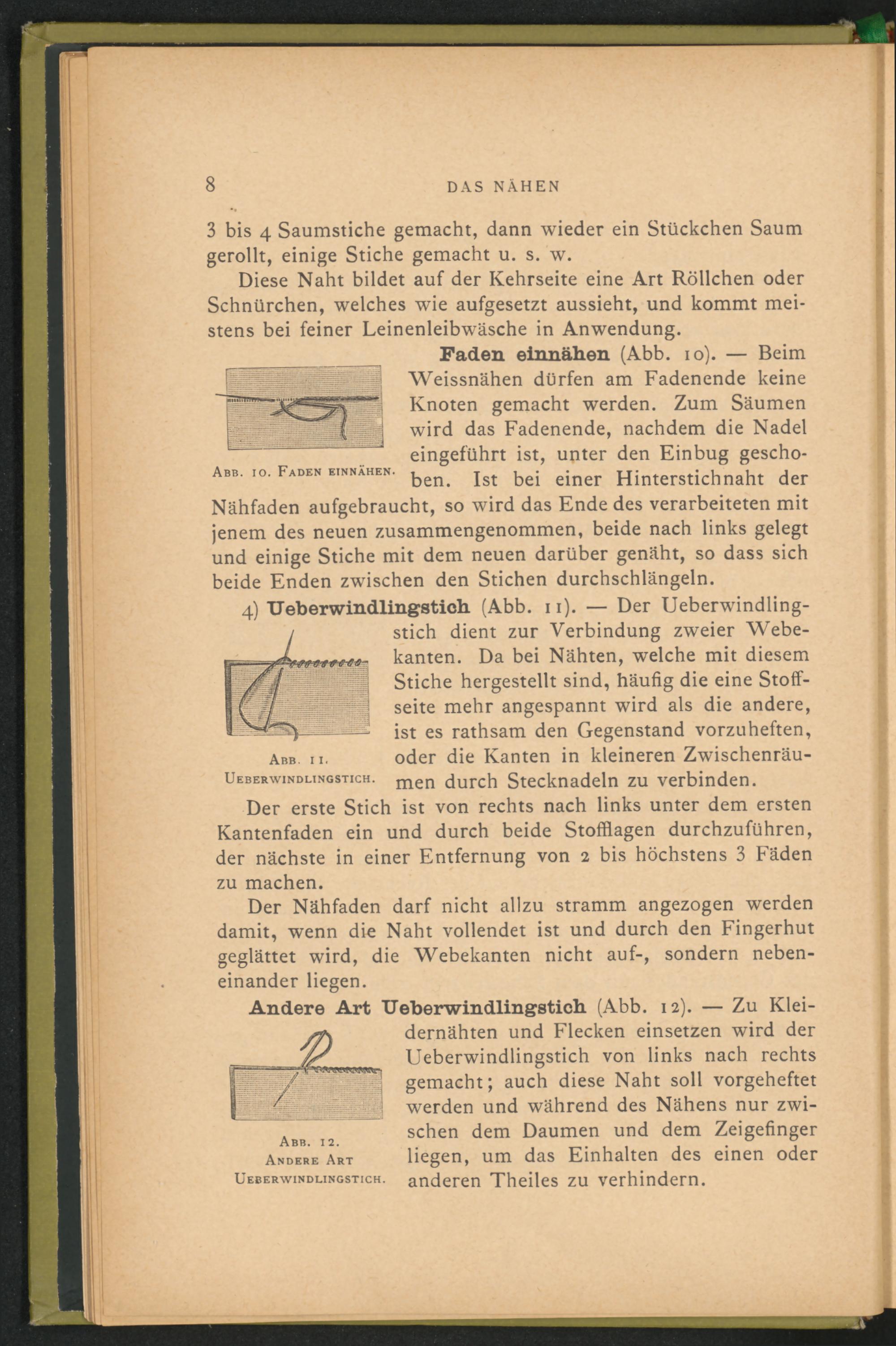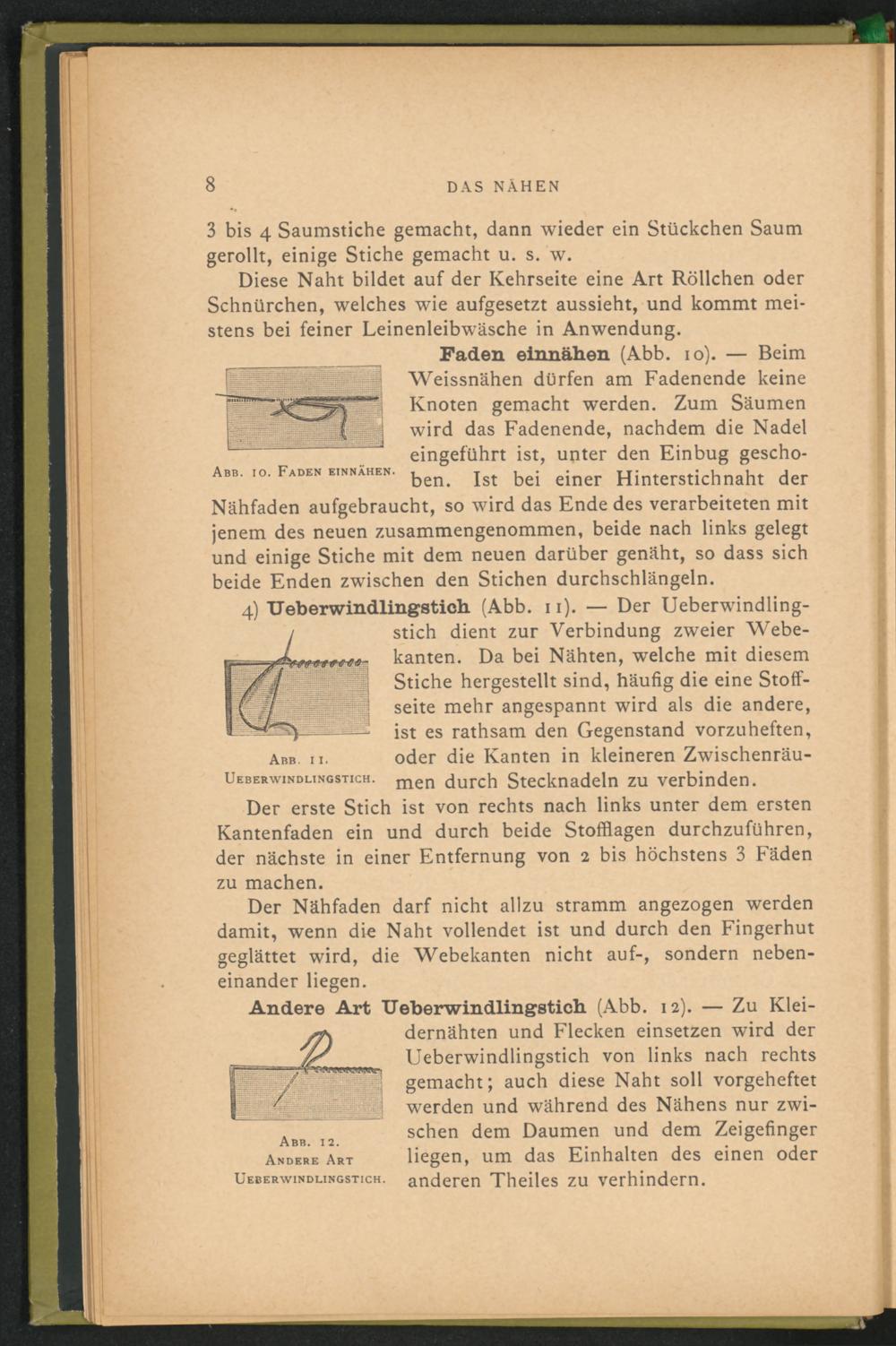 Faden einnähen (Abb. io). — Beim Weissnähen dürfen am Fadenende keine Knoten gemacht werden. Zum Säumen wird das Fadenende, nachdem die Nadel eingeführt ist, unter den Einbug geschoben. Ist bei einer Hinterstichnaht der Nähfaden aufgebraucht, so wird das Ende des verarbeiteten mit jenem des neuen zusammengenommen, beide nach links gelegt und einige Stiche mit dem neuen darüber genäht, so dass sich beide Enden zwischen den Stichen durchschlängeln.