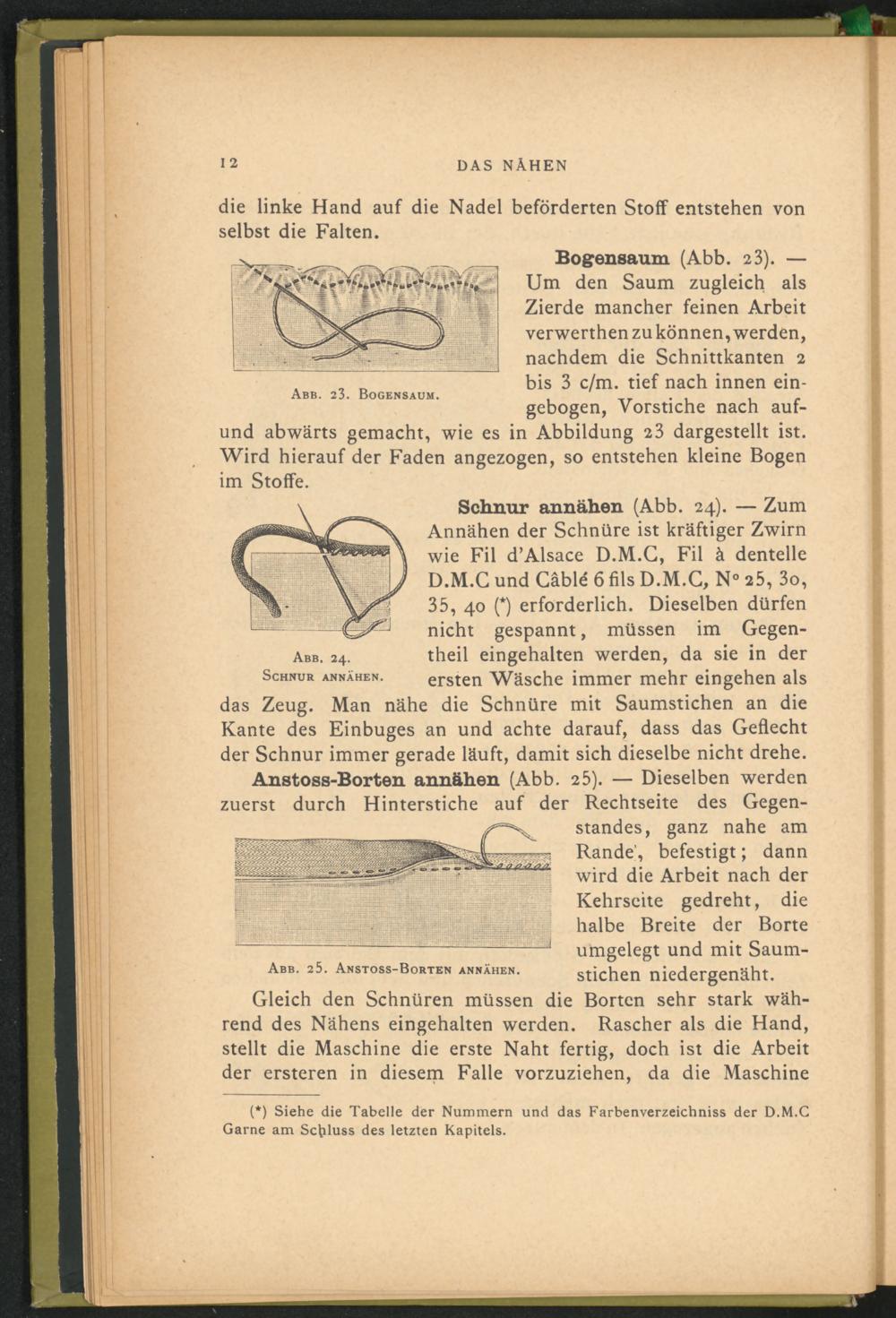 Schnur annähen (Abb. 24). — Zum Annähen der Schnüre ist kräftiger Zwirn wie Fil d’Alsace D.M.C, Fil à dentelle D.M.C und Câblé 6 fils D.M.C, N° 25, 3o, 35, 40 (*) erforderlich. Dieselben dürfen nicht gespannt, müssen im Gegen- theil eingehalten werden, da sie in der ersten Wäsche immer mehr eingehen als das Zeug. Man nähe die Schnüre mit Saumstichen an die Kante des Einbuges an und achte darauf, dass das Geflecht der Schnur immer gerade läuft, damit sich dieselbe nicht drehe.
