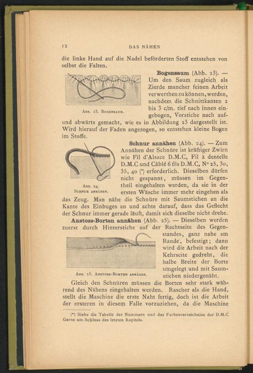 Gleich den Schnüren müssen die Borten sehr stark während des Nähens eingehalten werden. Rascher als die Hand, stellt die Maschine die erste Naht fertig, doch ist die Arbeit der ersteren in diesem Falle vorzuziehen, da die Maschine