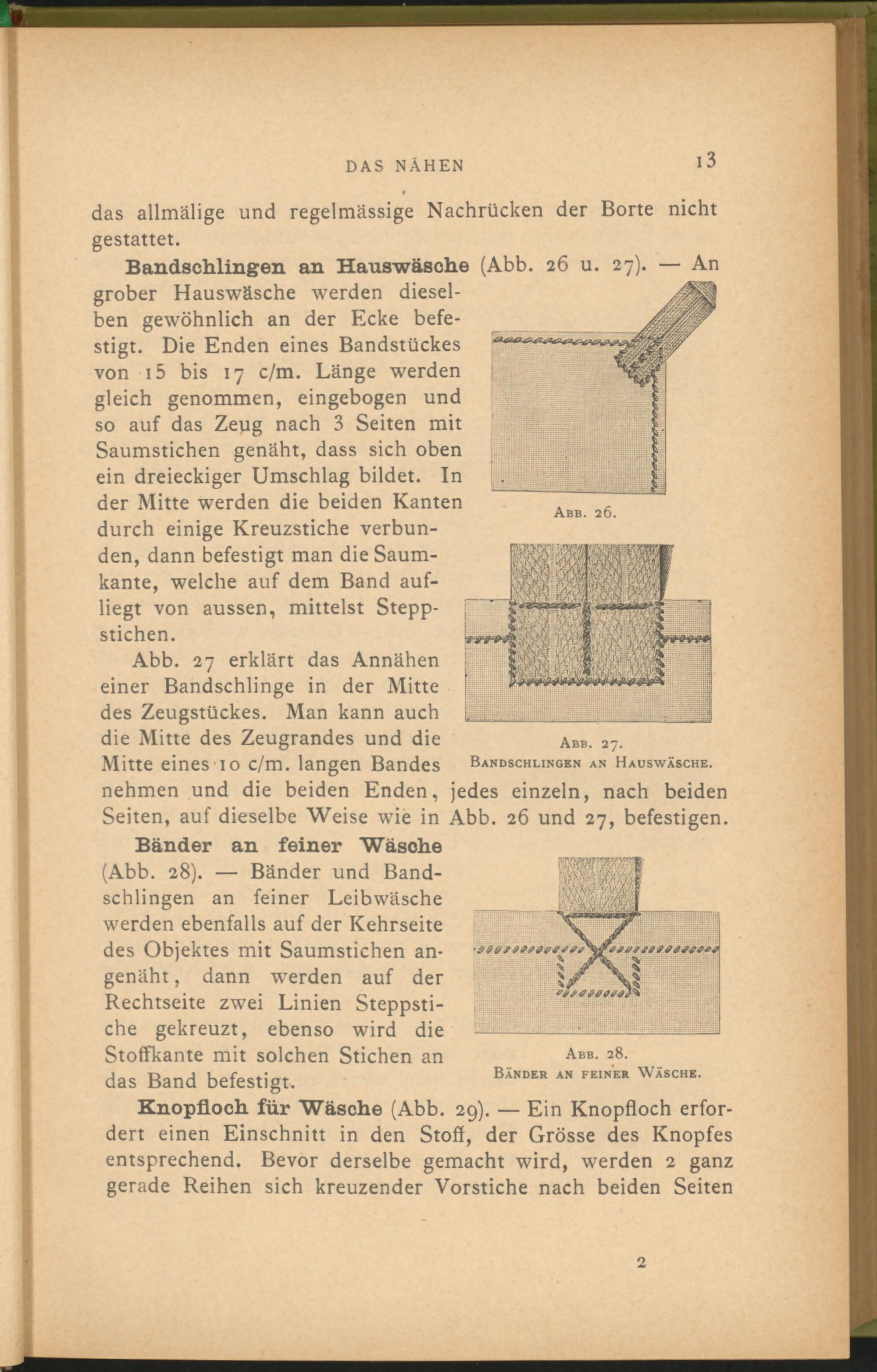 Bänder an feiner Wäsche (Abb. 28). — Bänder und Bandschlingen an feiner Leibwäsche werden ebenfalls auf der Kehrseite des Objektes mit Saumstichen angenäht , dann werden auf der Rechtseite zwei Linien Steppstiche gekreuzt, ebenso wird die Stoffkante mit solchen Stichen an das Band befestigt.