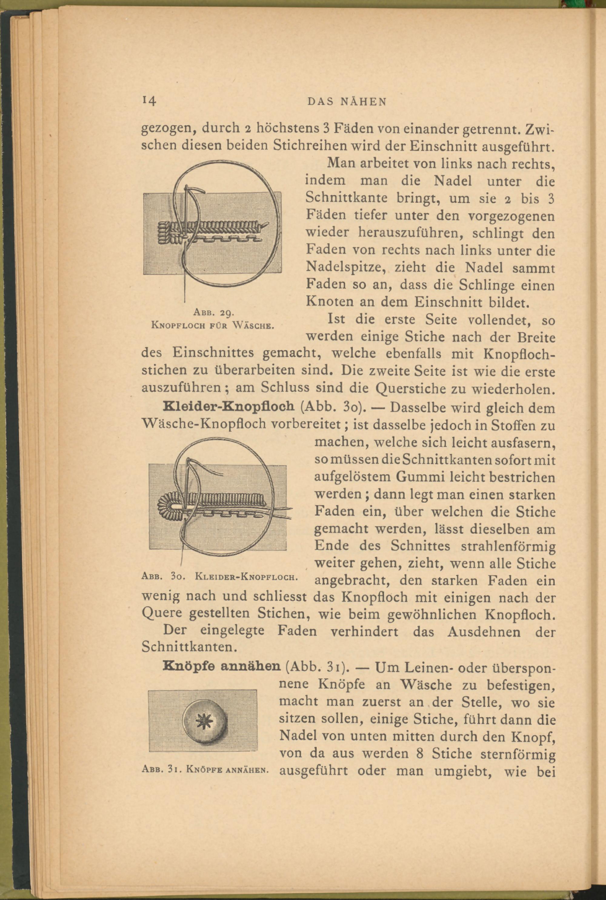 Kleider-Knopfloch (Abb. 3o). — Dasselbe wird gleich dem Wäsche-Knopfloch vorbereitet; ist dasselbe jedoch in Stoffen zu