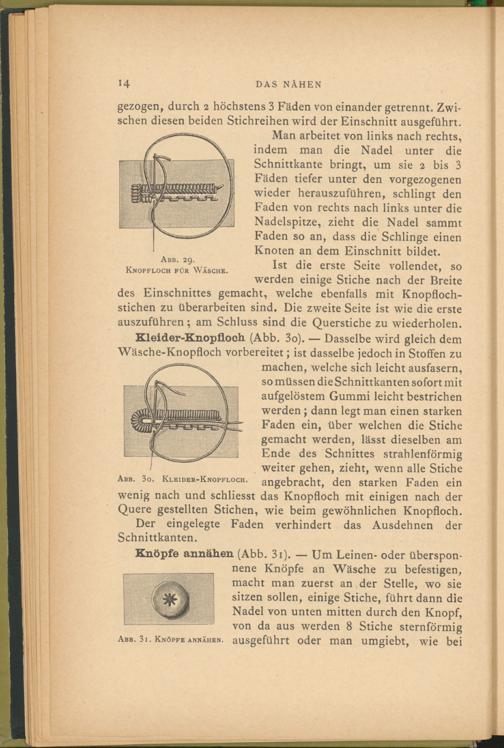 machen, welche sich leicht ausfasern, so müssen die Schnittkanten sofort mit aufgelöstem Gummi leicht bestrichen werden ; dann legt man einen starken Faden ein, über welchen die Stiche gemacht werden, lässt dieselben am Ende des Schnittes strahlenförmig weiter gehen, zieht, wenn alle Stiche Abb. 3 o. Kleider-Knopfloch. angebracht, den starken Faden ein wenig nach und schliesst das Knopfloch mit einigen nach der Quere gestellten Stichen, wie beim gewöhnlichen Knopfloch.