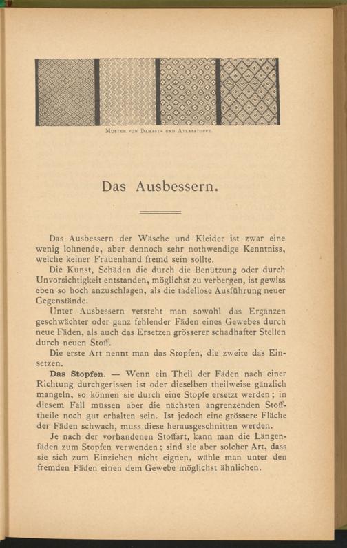 Das Ausbessern der Wäsche und Kleider ist zwar eine wenig lohnende, aber dennoch sehr nothwendige Kenntniss, welche keiner Frauenhand fremd sein sollte.