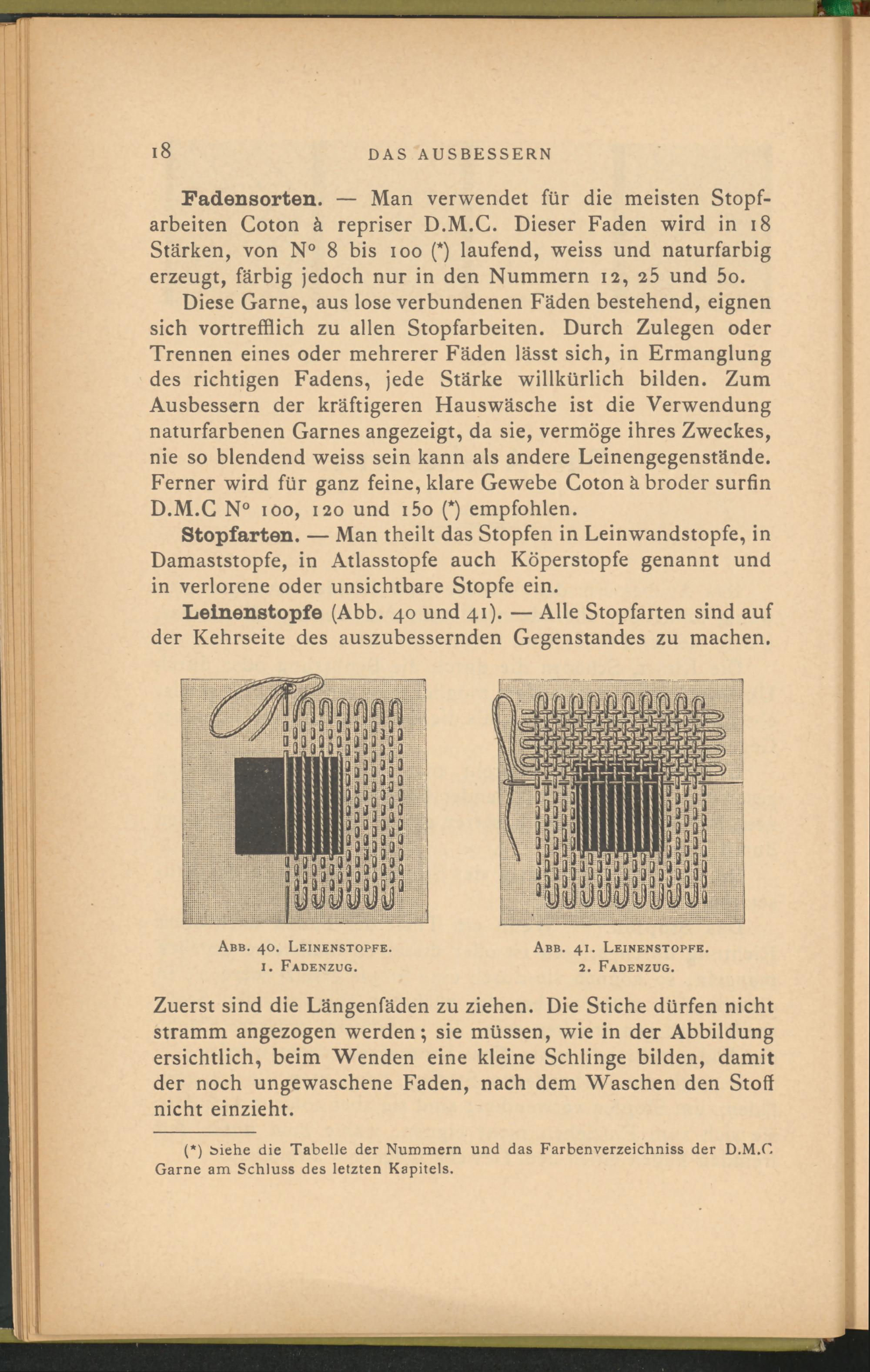 Fadensorten. — Man verwendet für die meisten Stopfarbeiten Coton ä repriser D.M.C. Dieser Faden wird in 18 Stärken, von N° 8 bis ioo (*) laufend, weiss und naturfarbig erzeugt, färbig jedoch nur in den Nummern 12, 25 und 5 o.